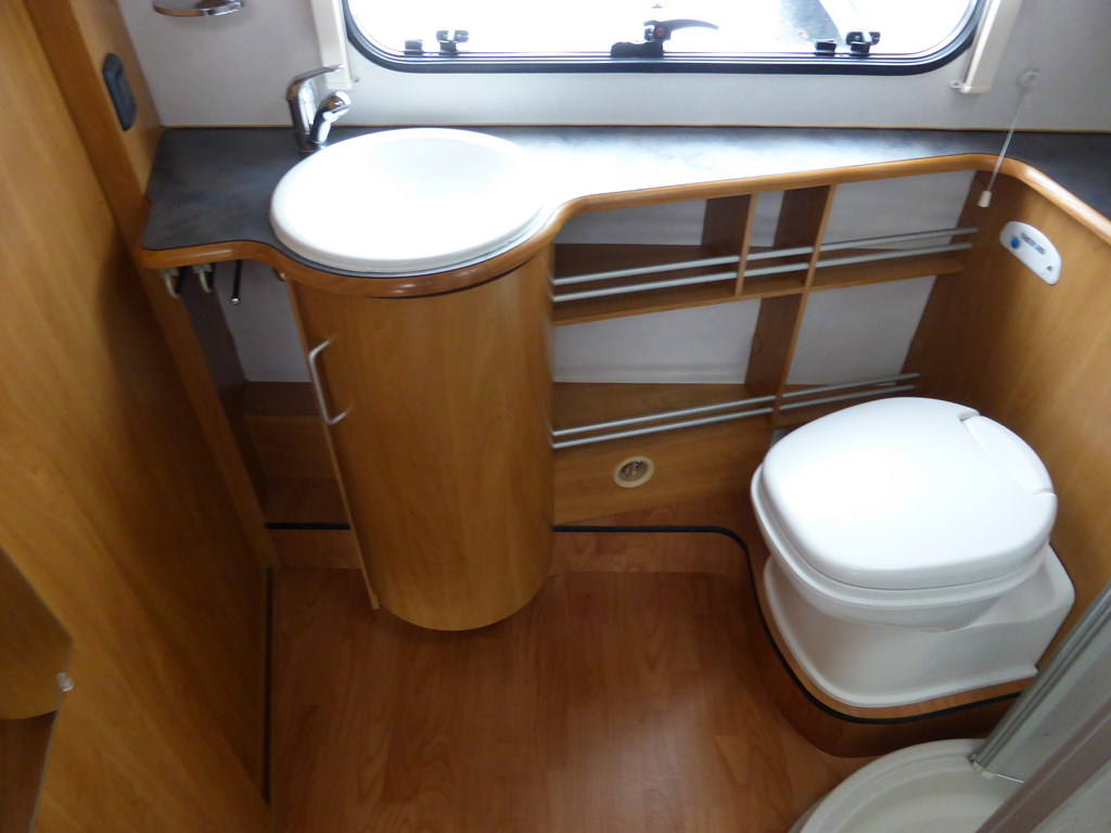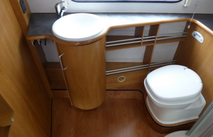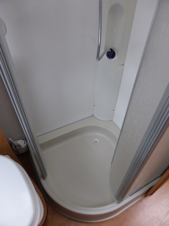 Spacious end washroom with a shower cubicle, cassette toilet with electric flush, hand basin and a good size wardrobe.