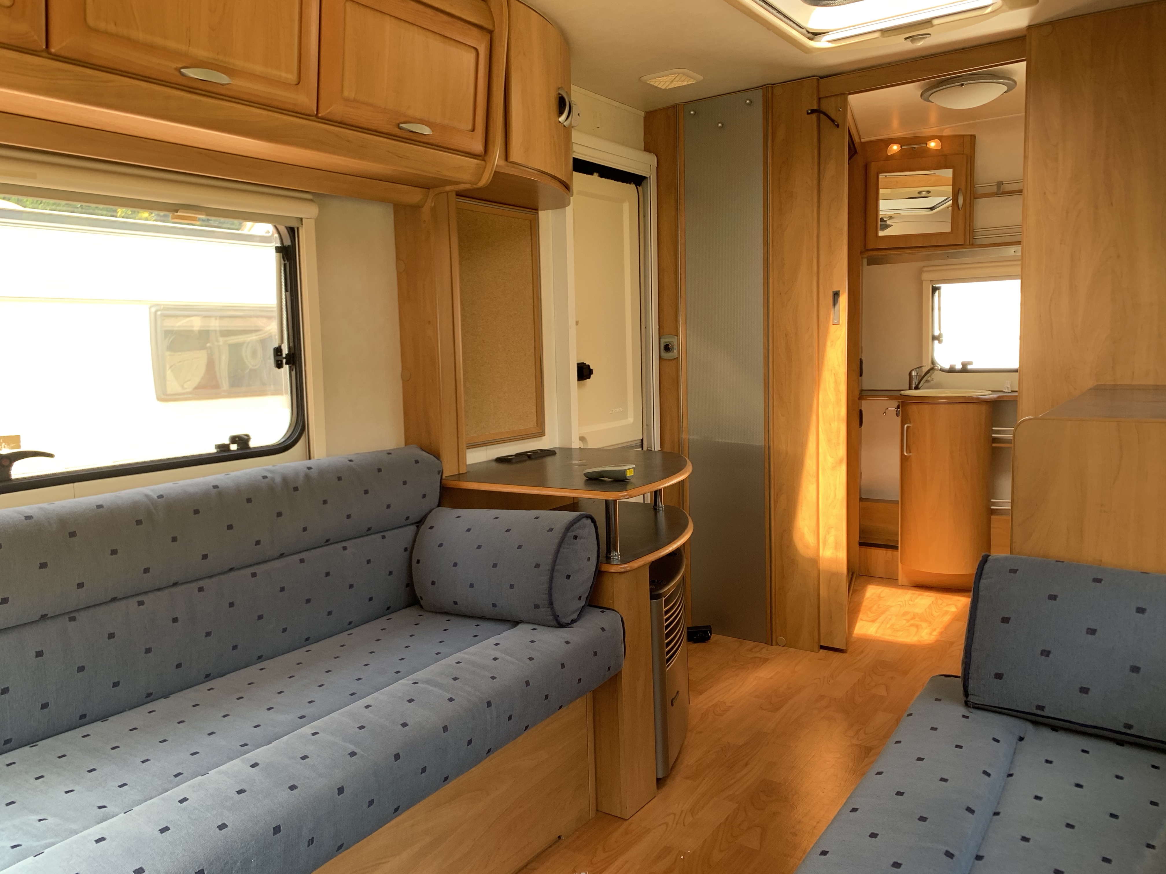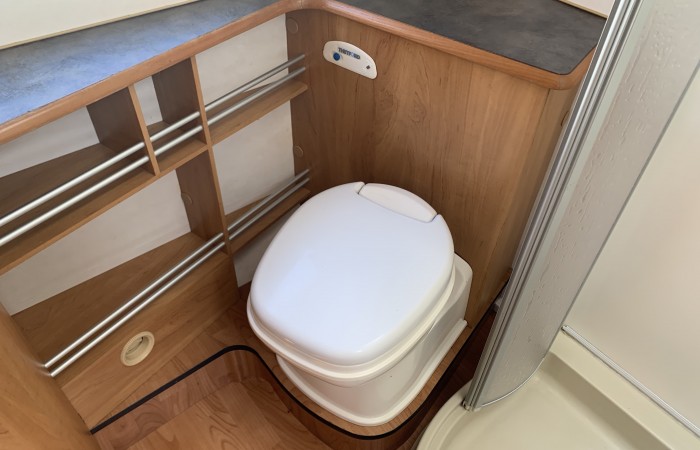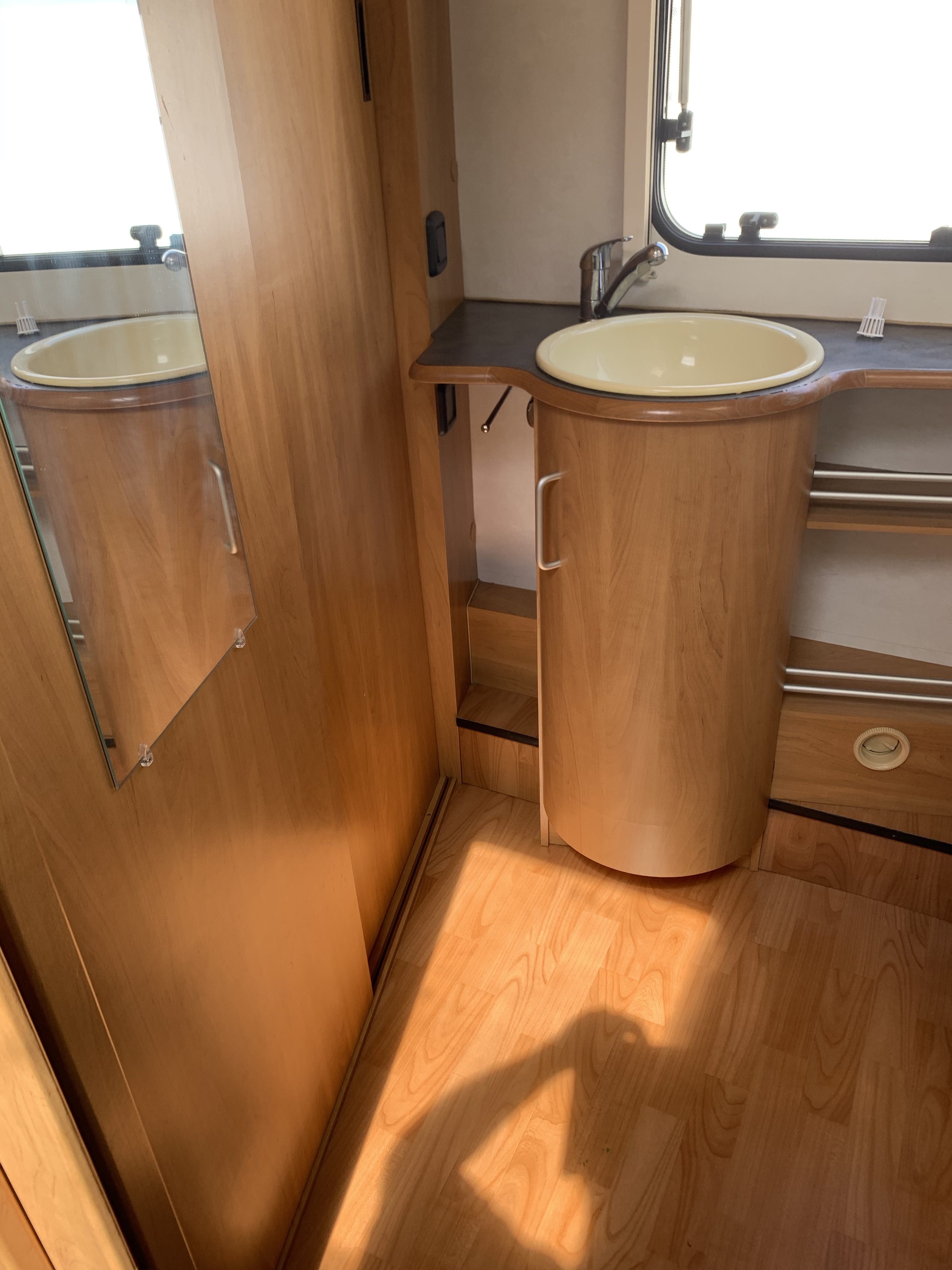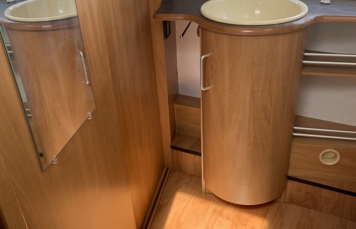 Another beautiful 2 berth Hymer in good condition for the year and has a spacious end washroom with a shower cubicle, cassette toilet with electric flush, hand basin and a good size wardrobe.