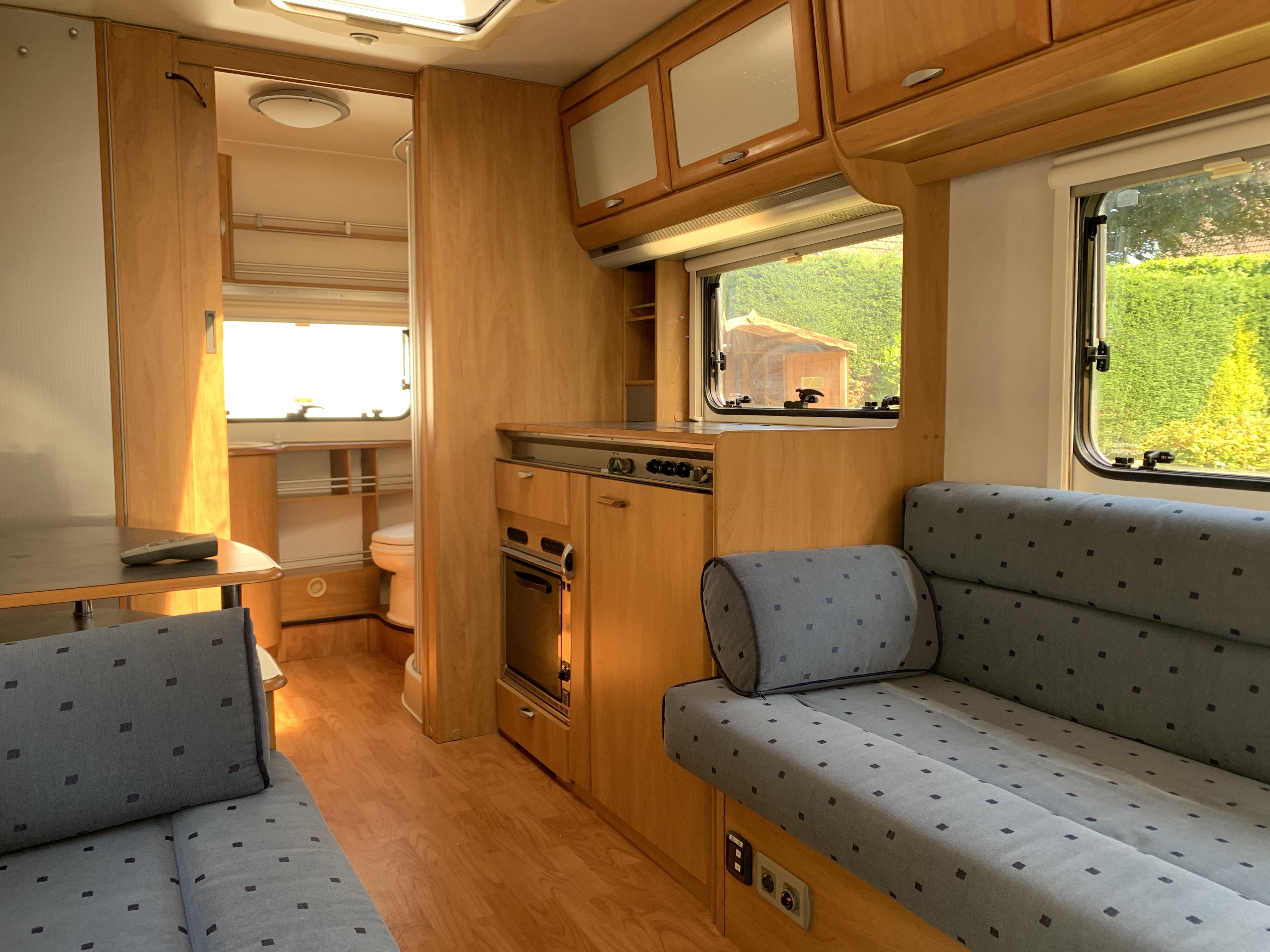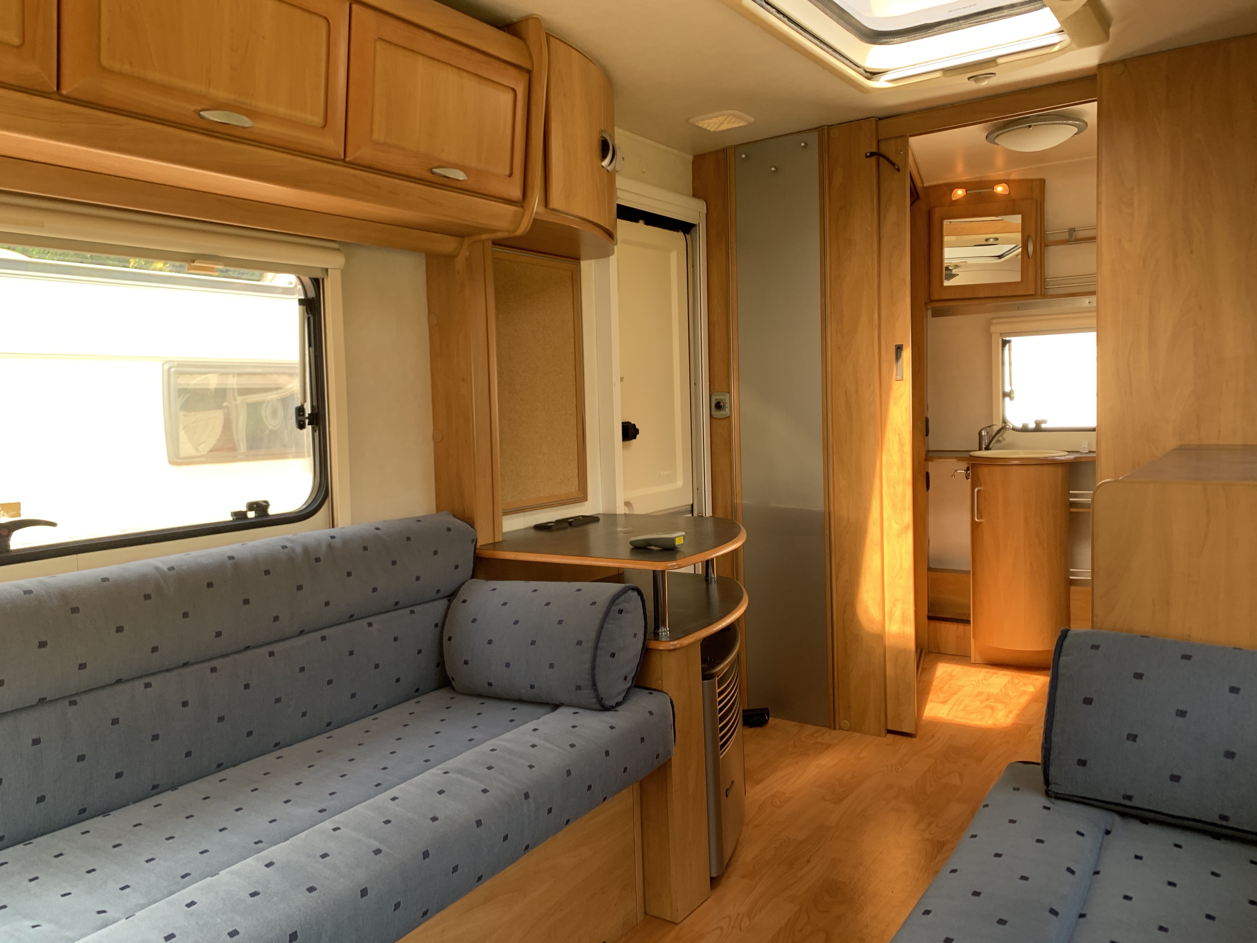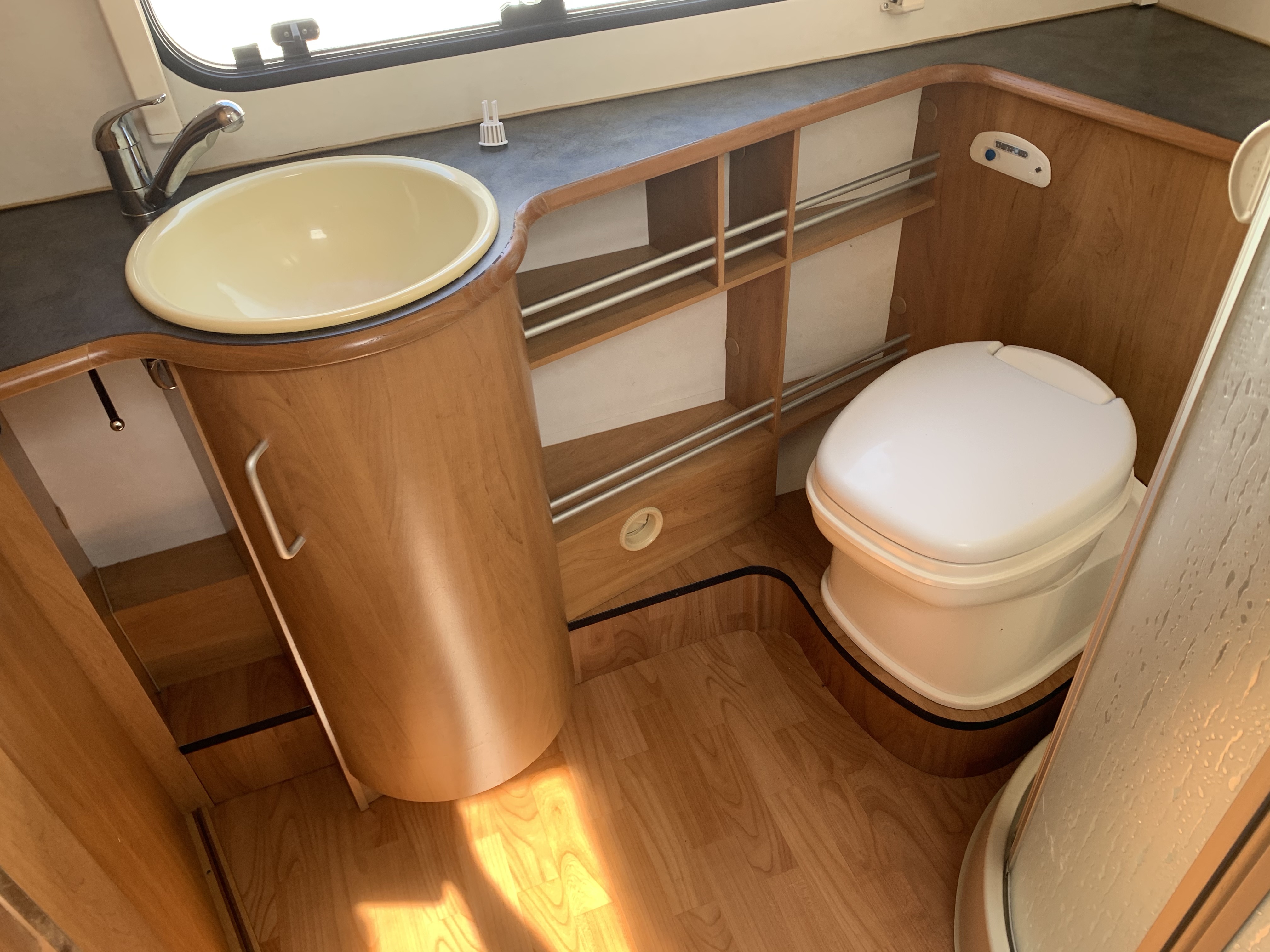 Another beautiful 2 berth Hymer in good condition for the year and has a spacious end washroom with a shower cubicle, cassette toilet with electric flush, hand basin and a good size wardrobe.
