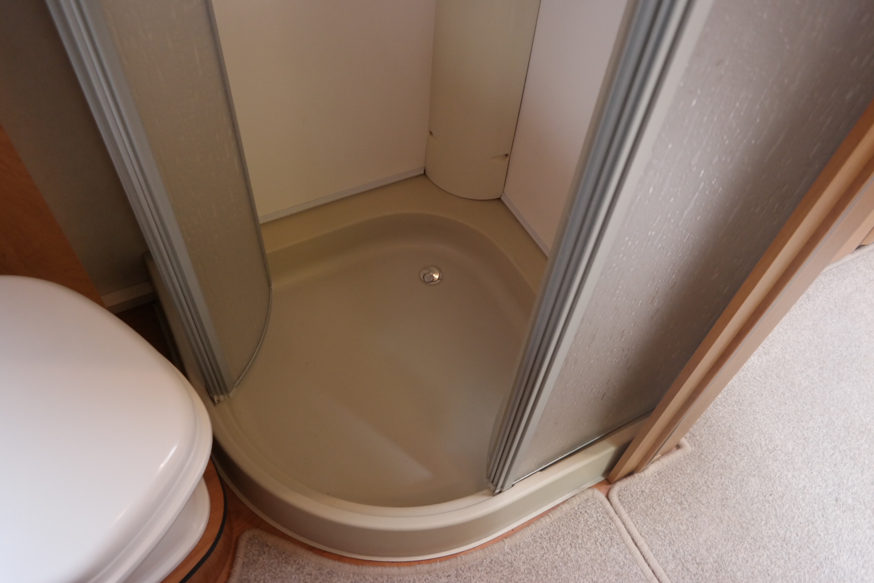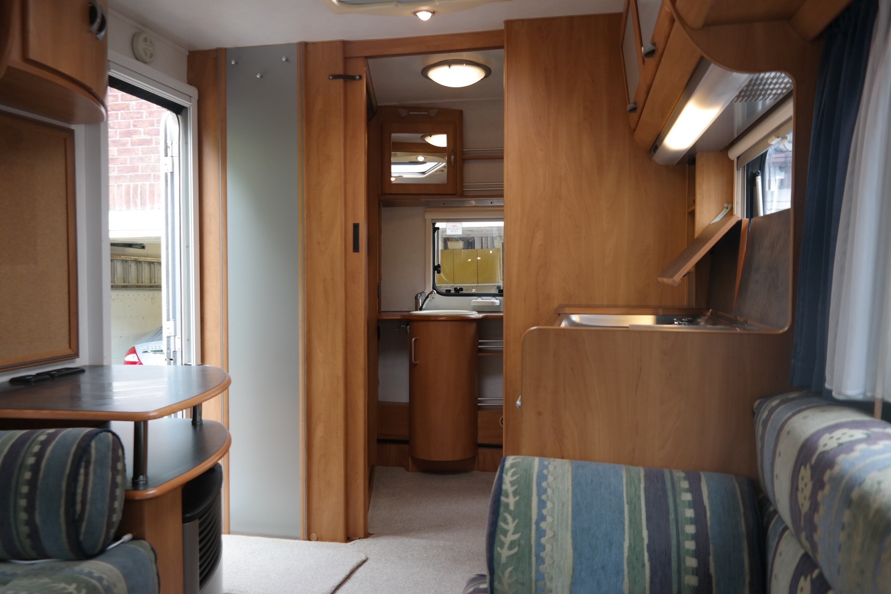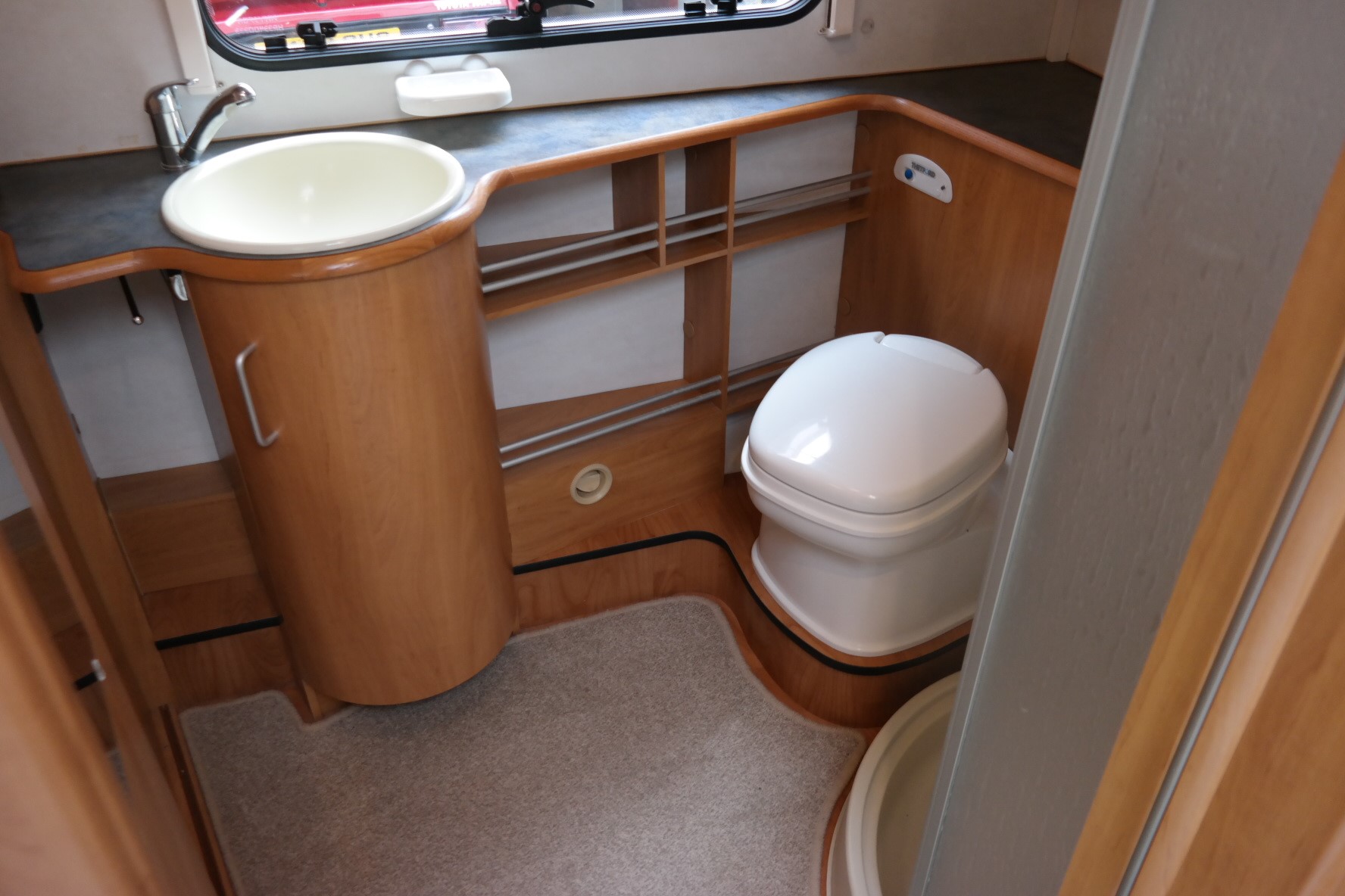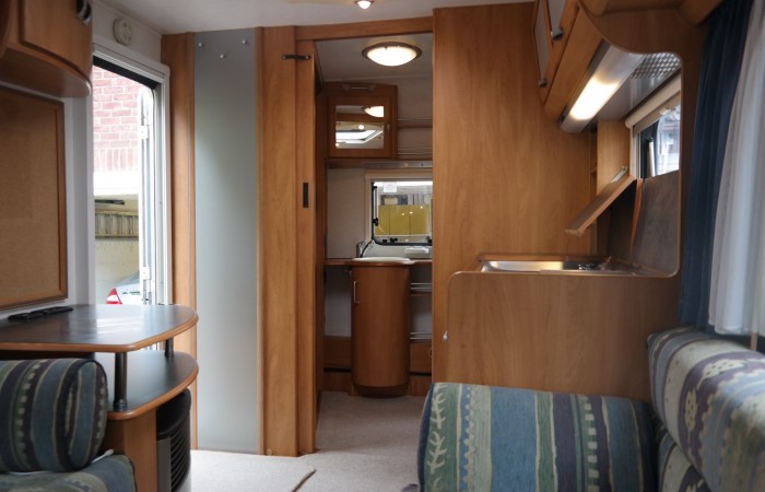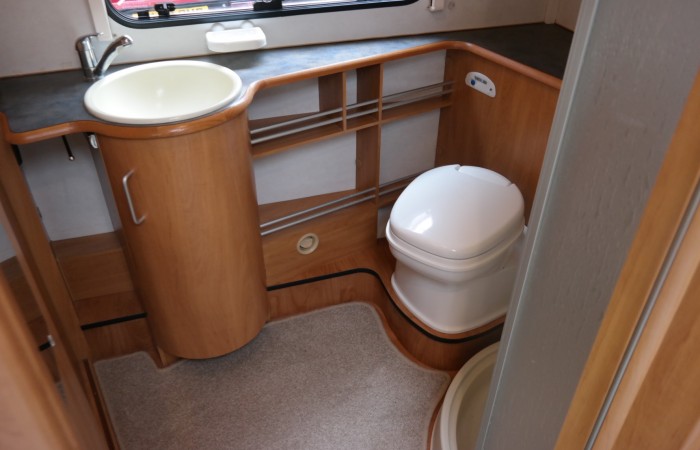 This beautiful 2 berth Hymer is in exceptional condition and has a spacious end washroom with a shower cubicle, cassette toilet with electric flush, hand basin and a good size wardrobe.