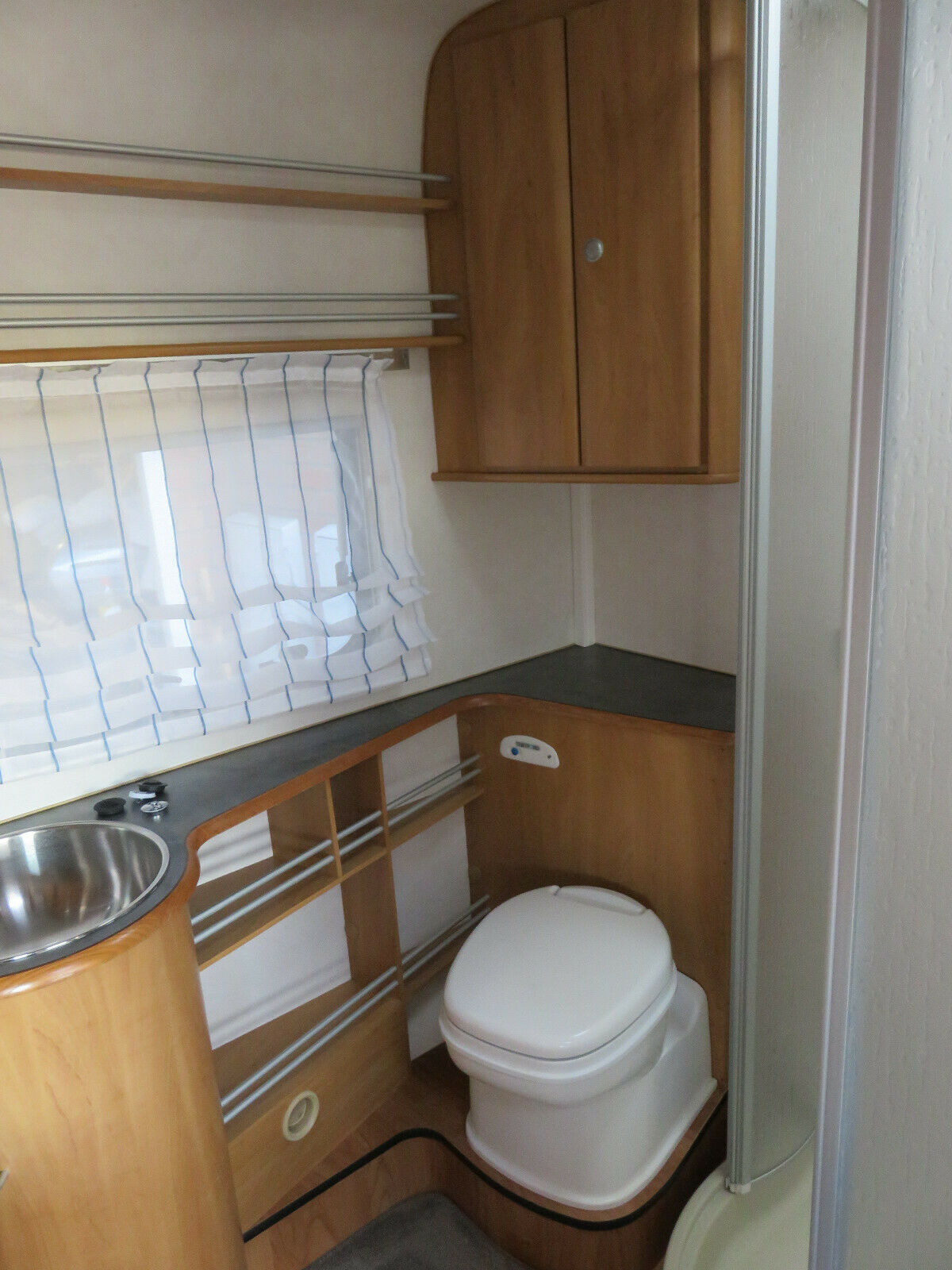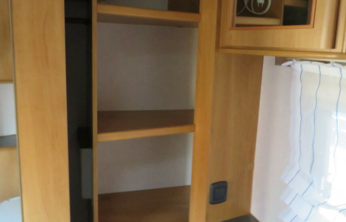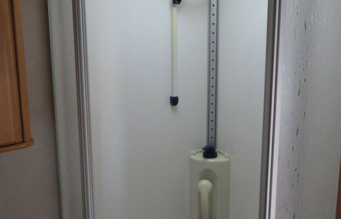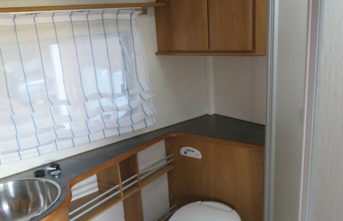 This caravan has an end washroom with an electric flush cassette toilet, hand basin, separate shower cubicle and wardrobe.