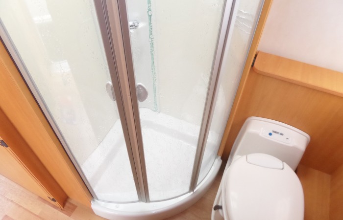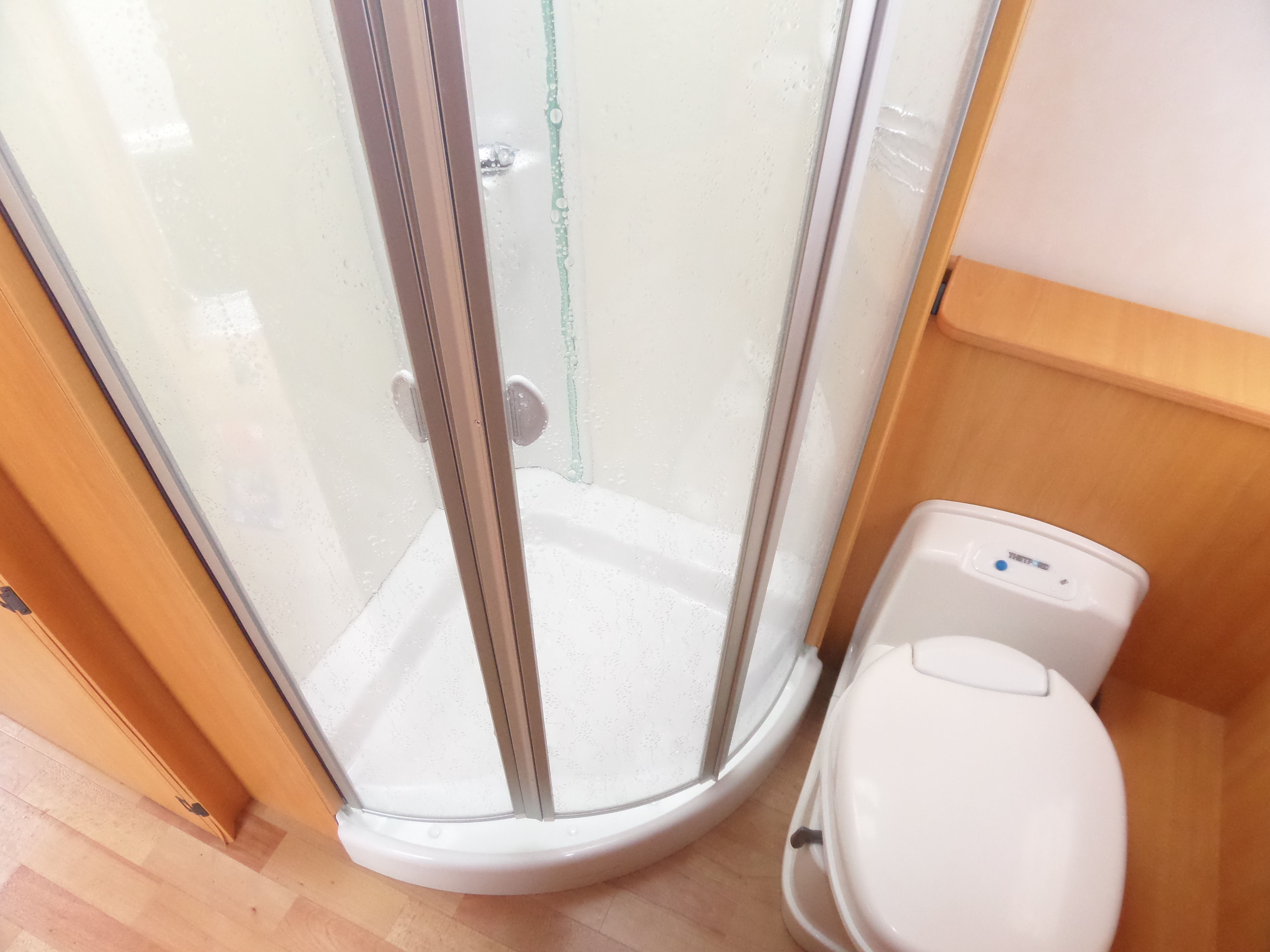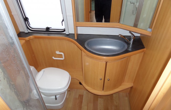 At the rear is a spacious washroom with separate shower cubicle, vanity and electric flush Thetford cassette toilet.