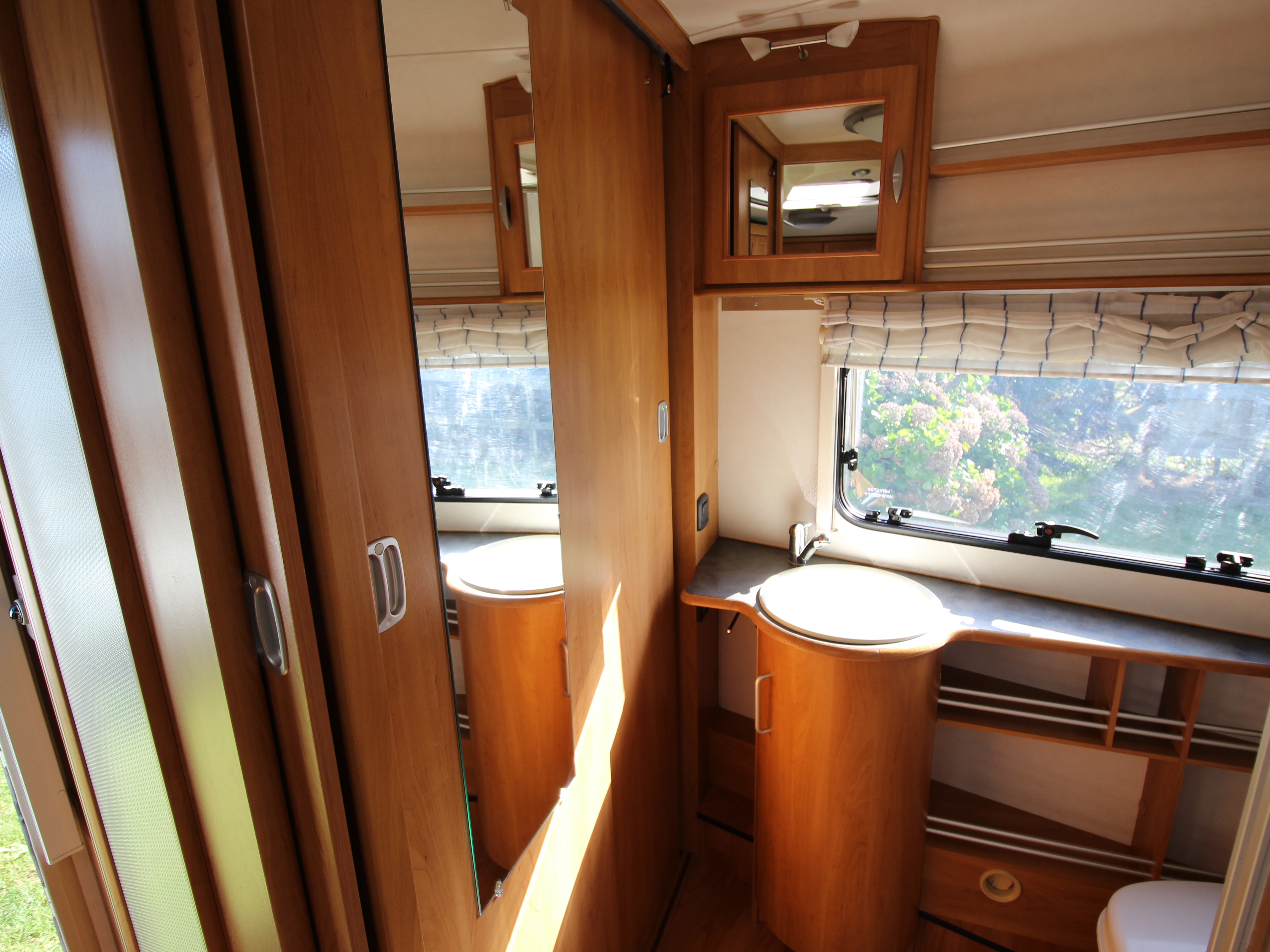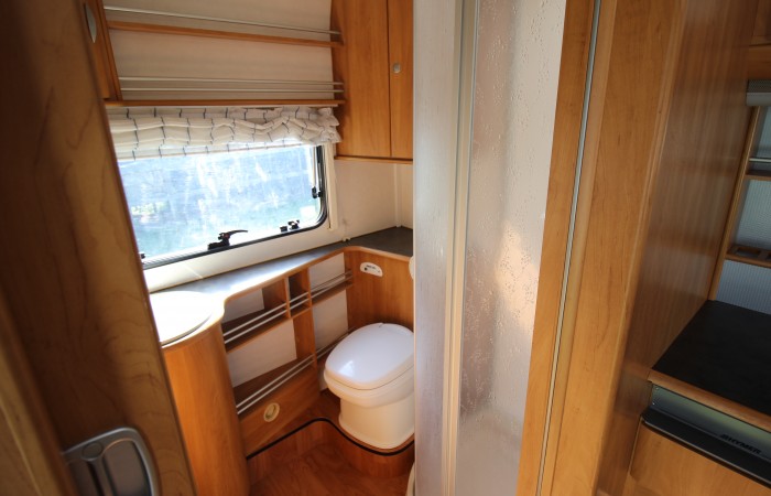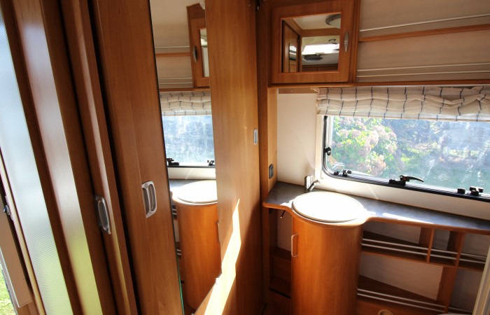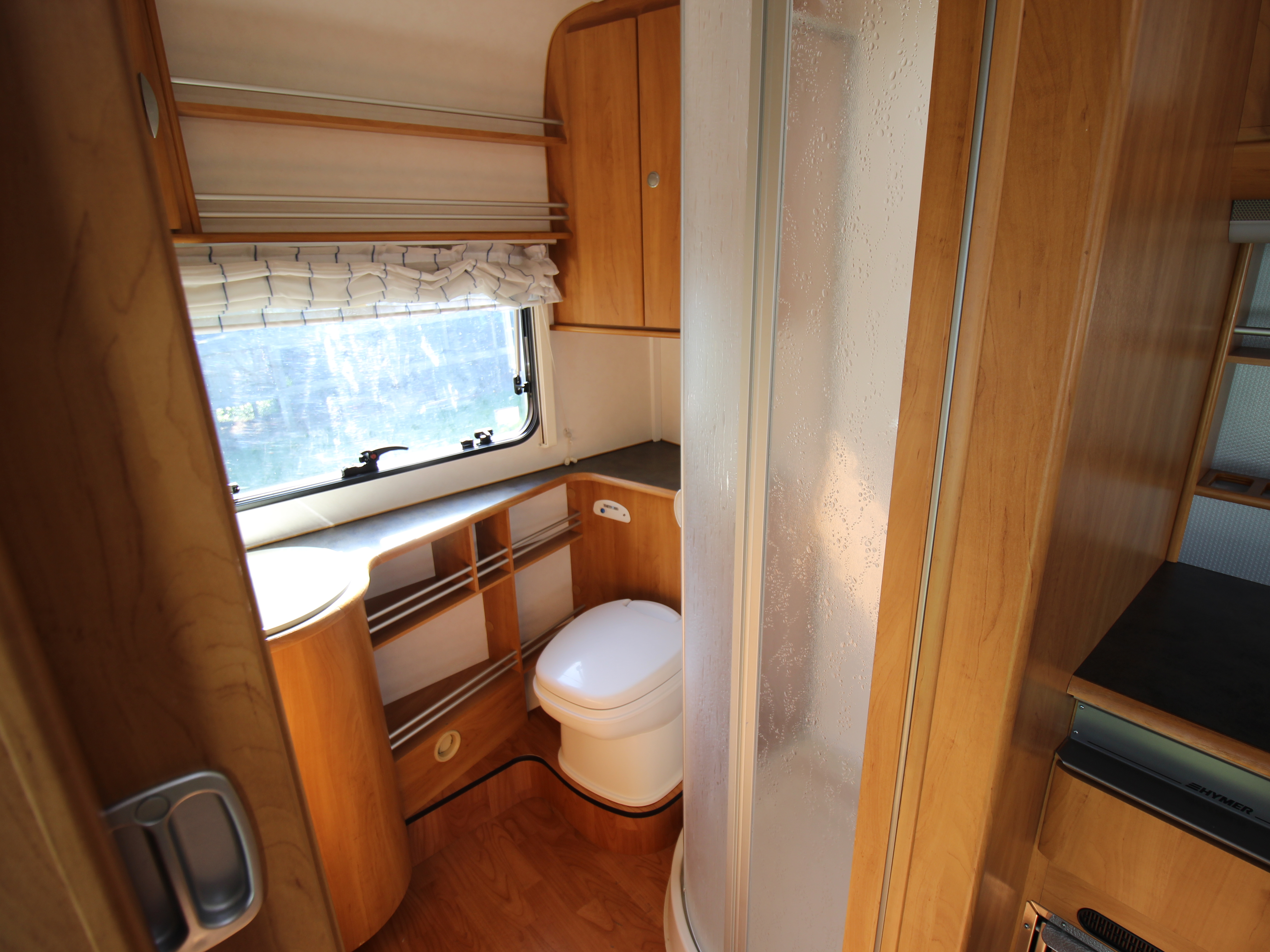 This beautiful 2 berth Hymer is in exceptional condition and has a spacious end washroom with a shower cubicle, cassette toilet with electric flush, hand basin and a good size wardrobe.