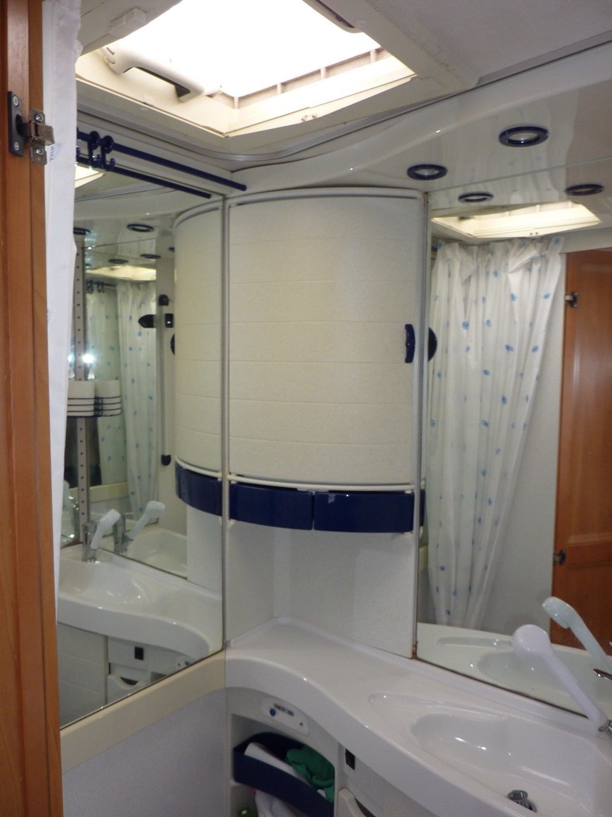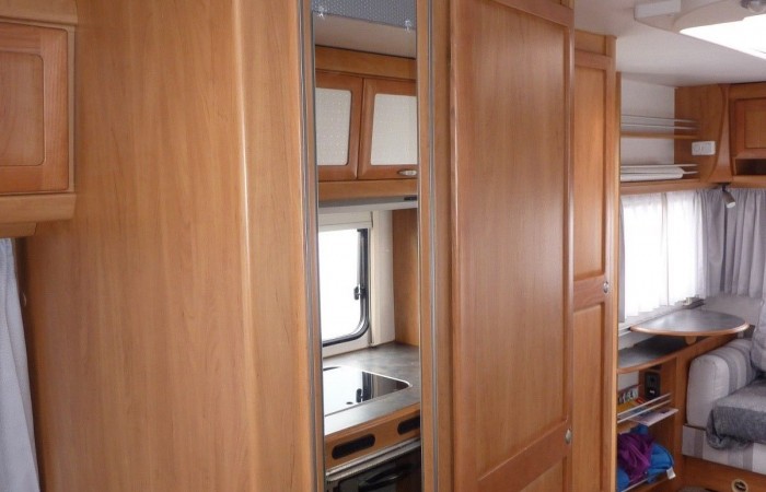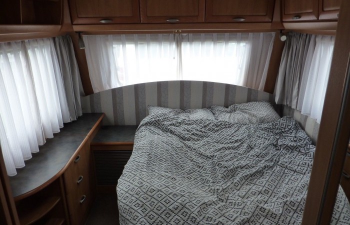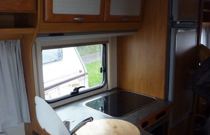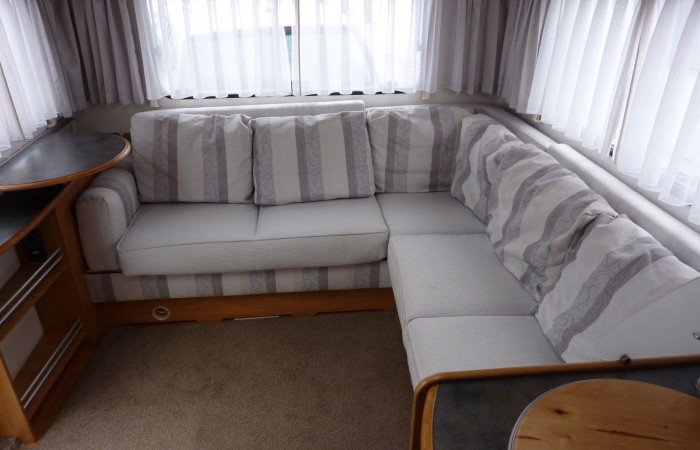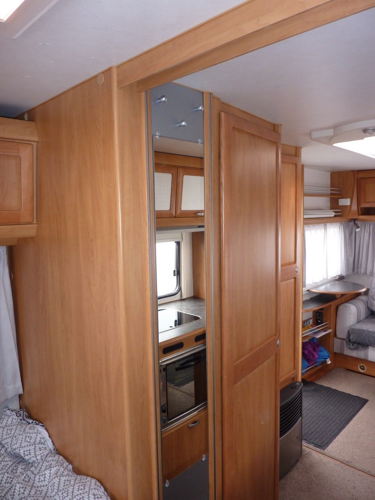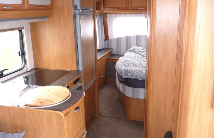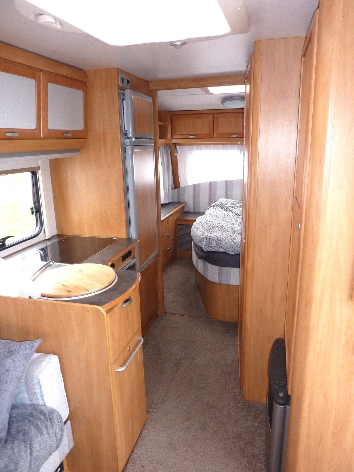 Another beautiful German Hymer caravan with a fixed double bed, spacious “L” shaped lounge, full kitchen with big fridge and separate freezer.