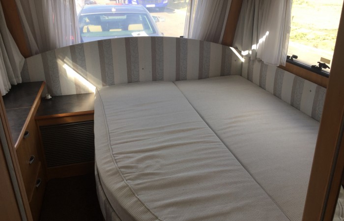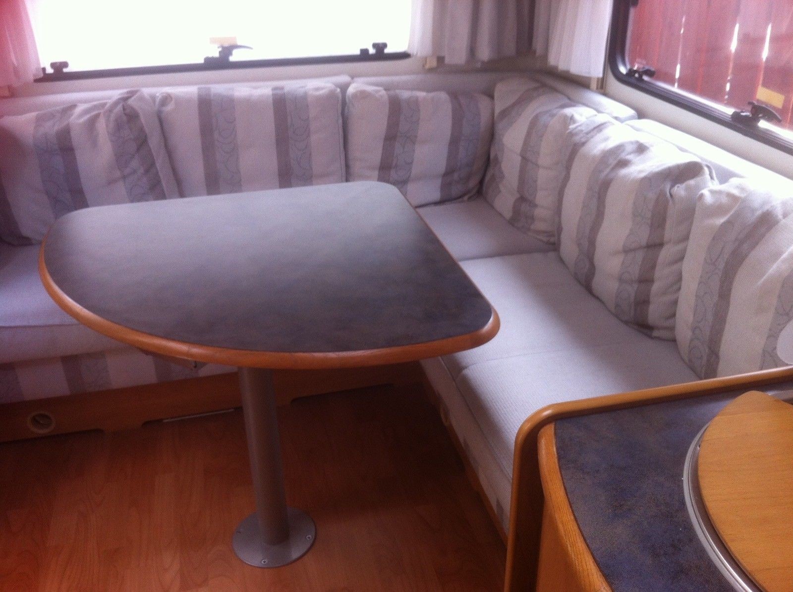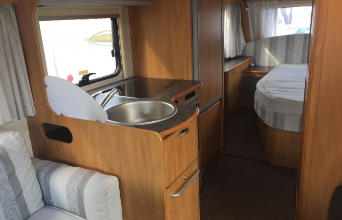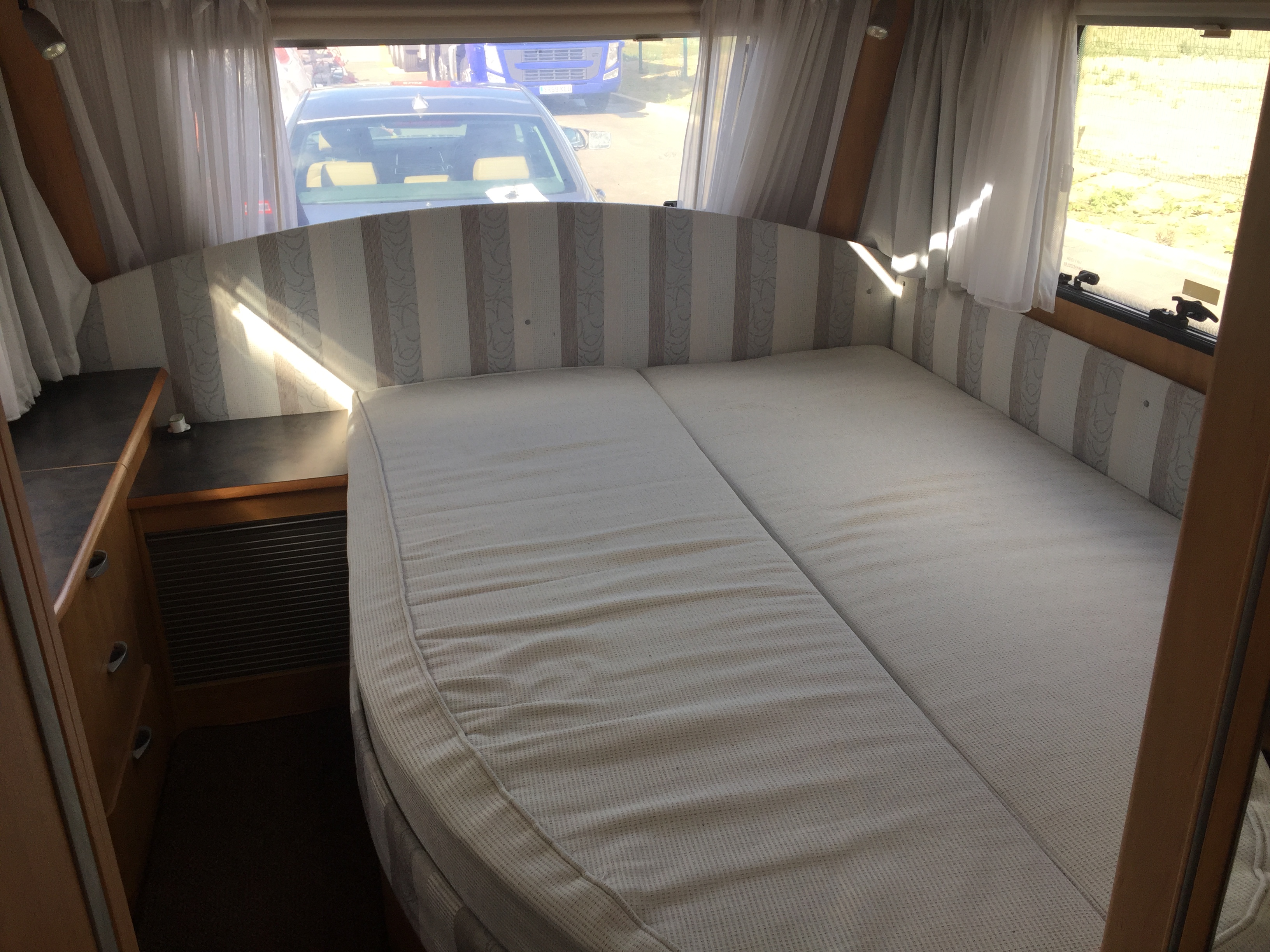 Another beautiful German Hymer caravan with a fixed double bed,  spacious “L” shaped lounge with sliding table, full kitchen with big fridge and separate freezer.