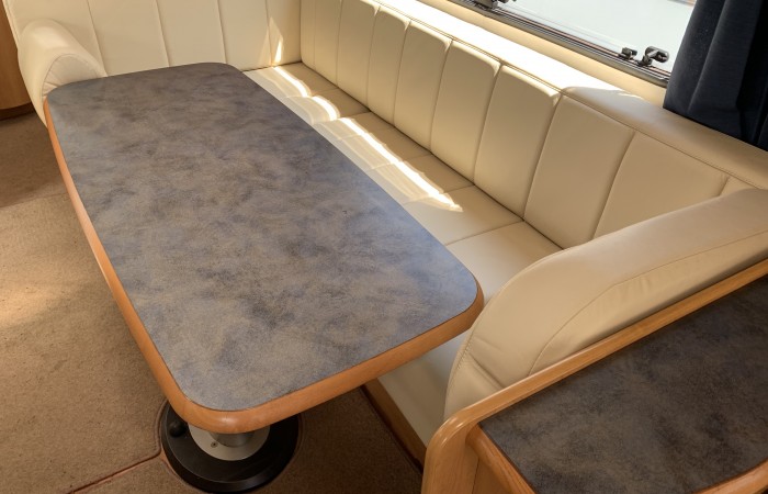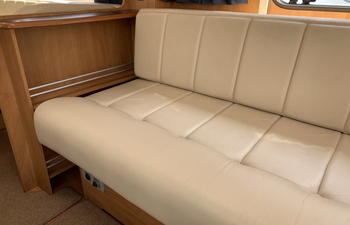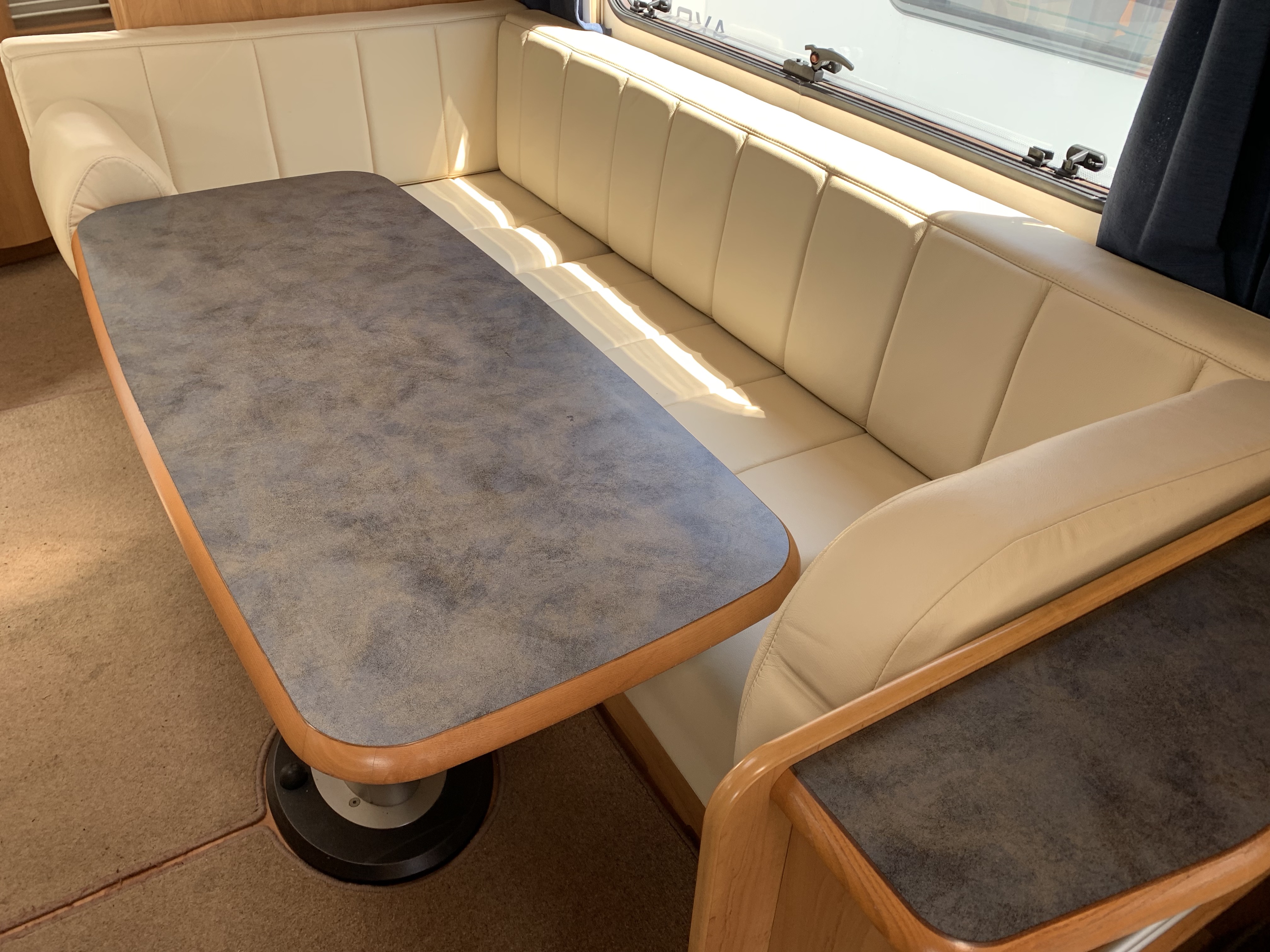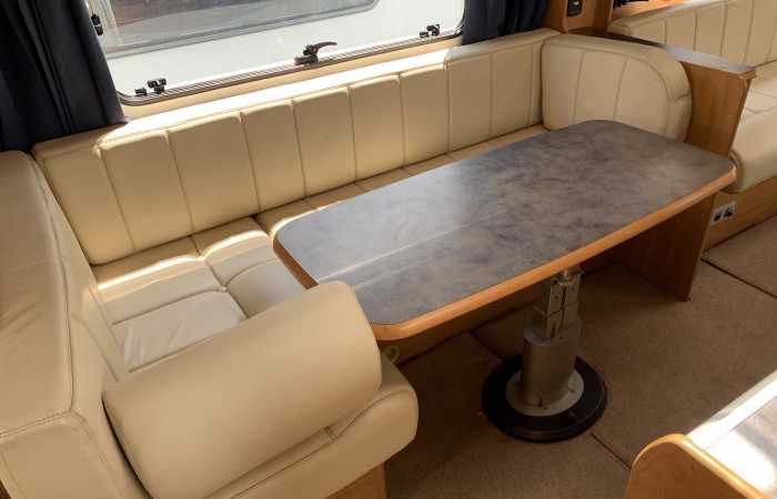 A desirable layout for those who want the option to set up the parallel seats into a very large double bed and still have a place to sit, read and eat. The side dinette also converts to an extra large single bed providing the 3rd bed.