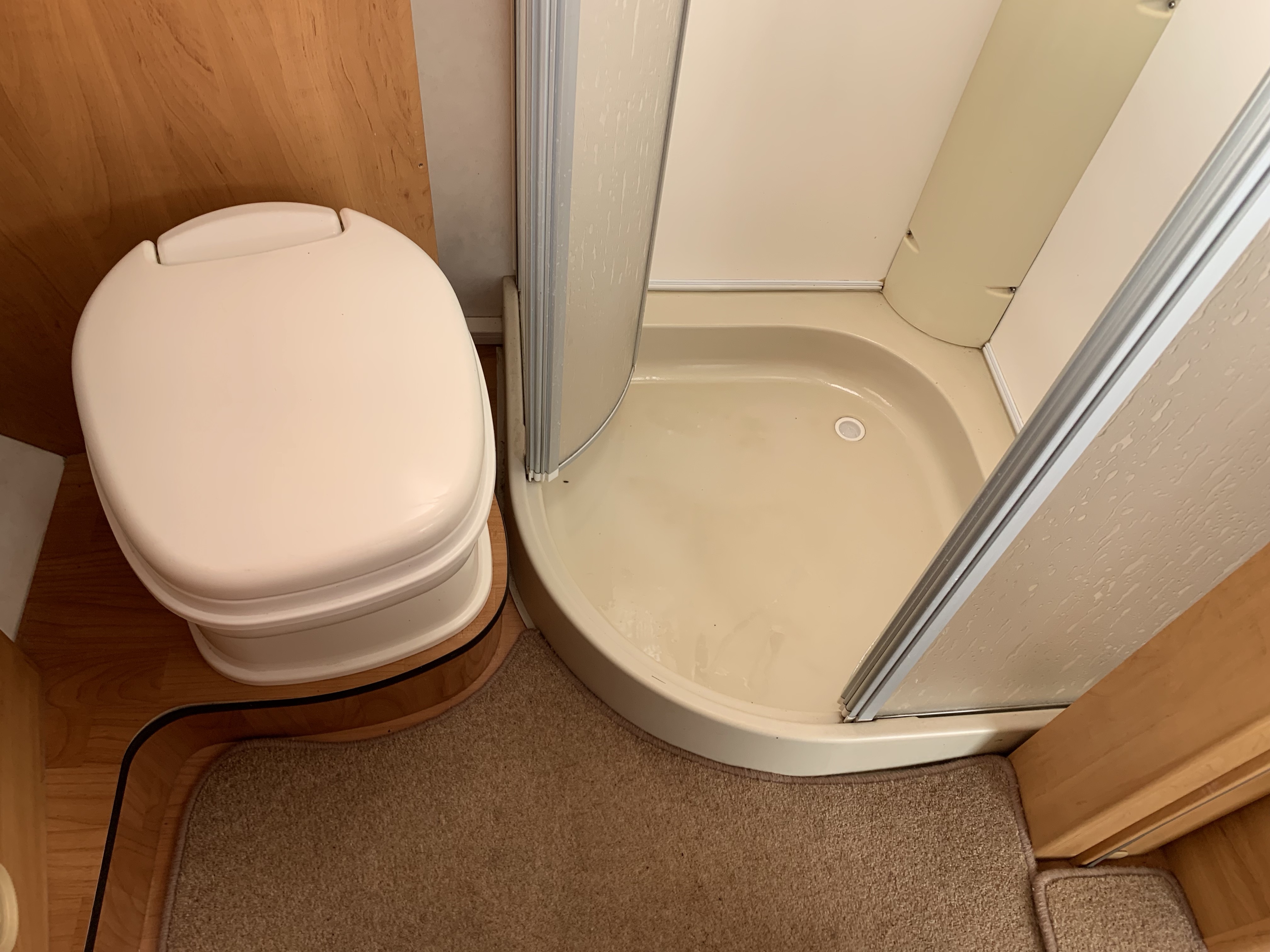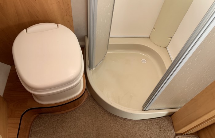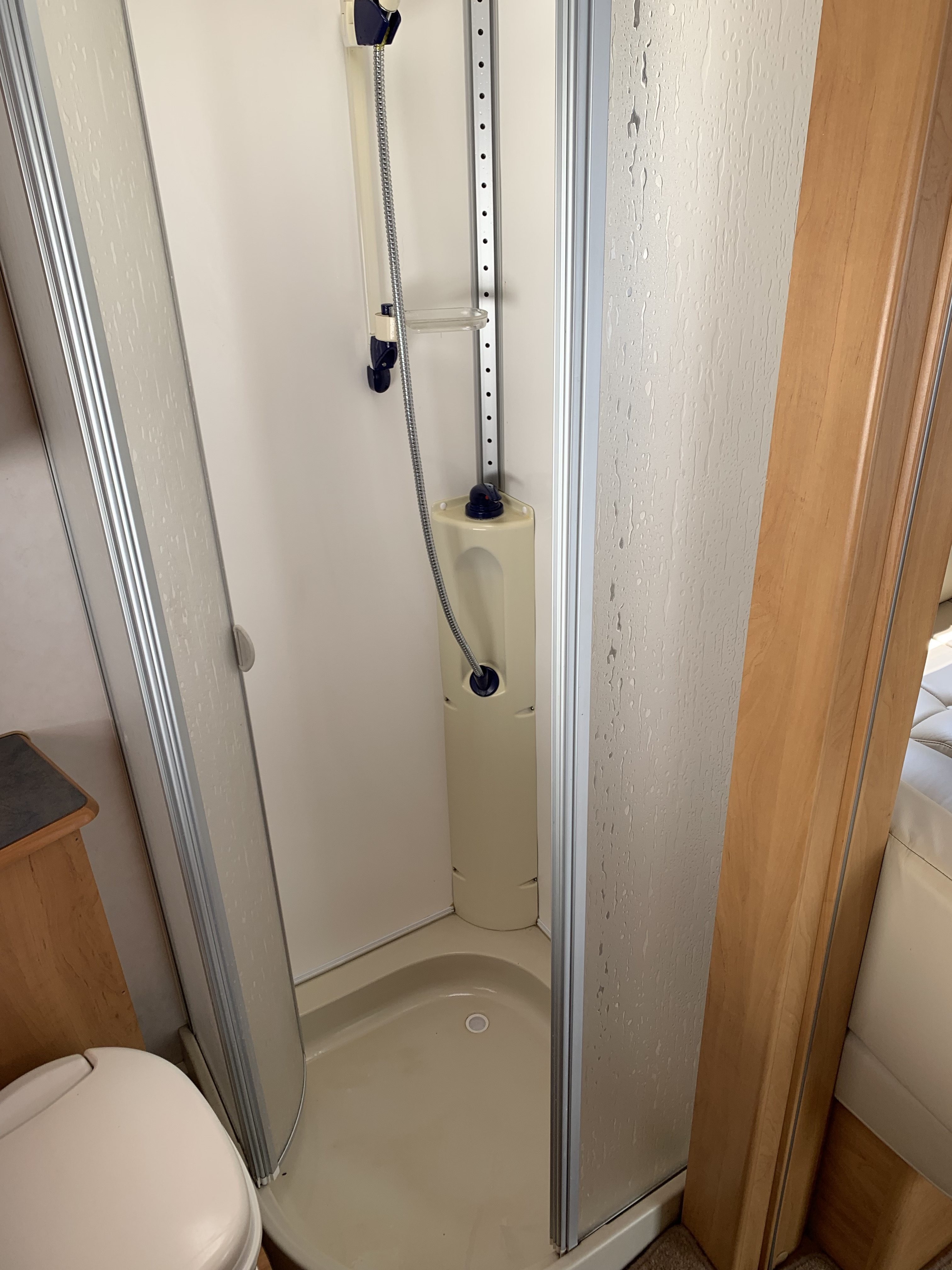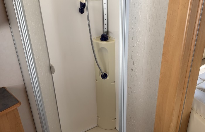 This caravan has an end washroom with an electric flush cassette toilet, hand basin, separate shower cubicle and wardrobe.