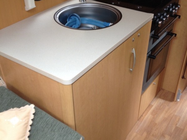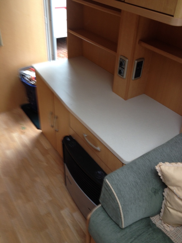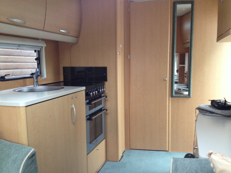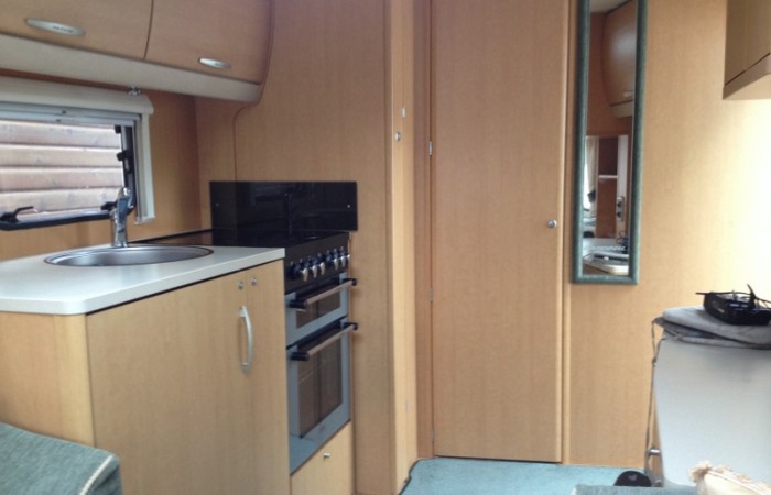- Central kitchen with 3 way fridge/freezer, hob/oven/grill, sink, additional bench opposite