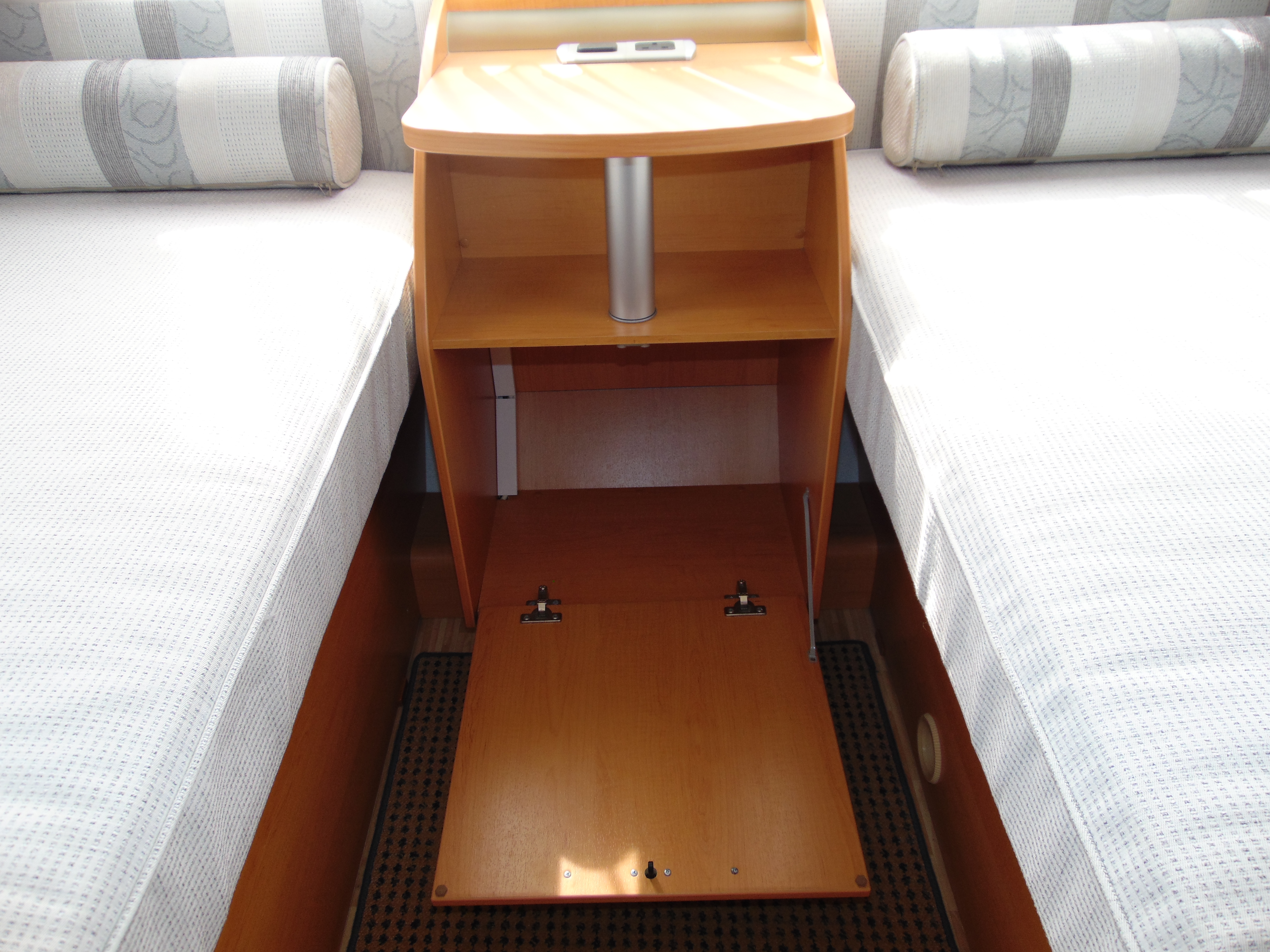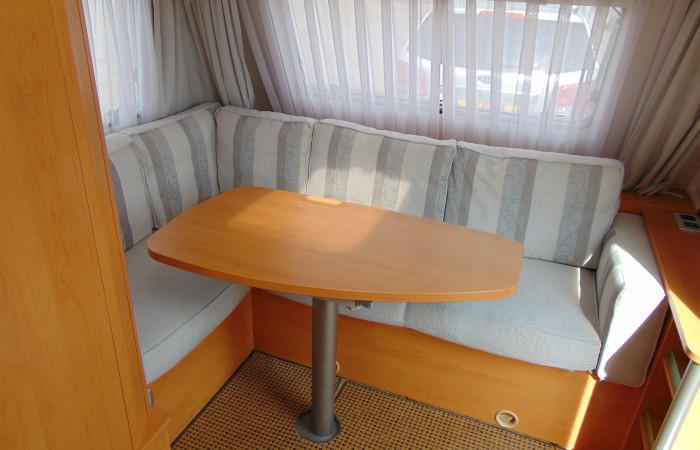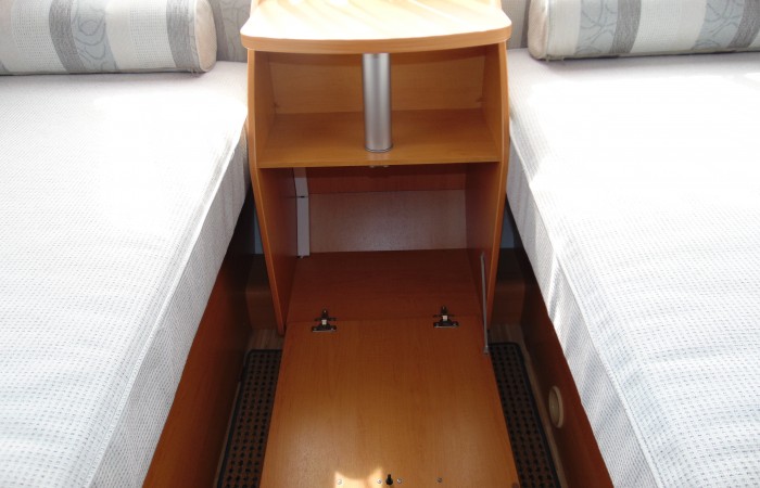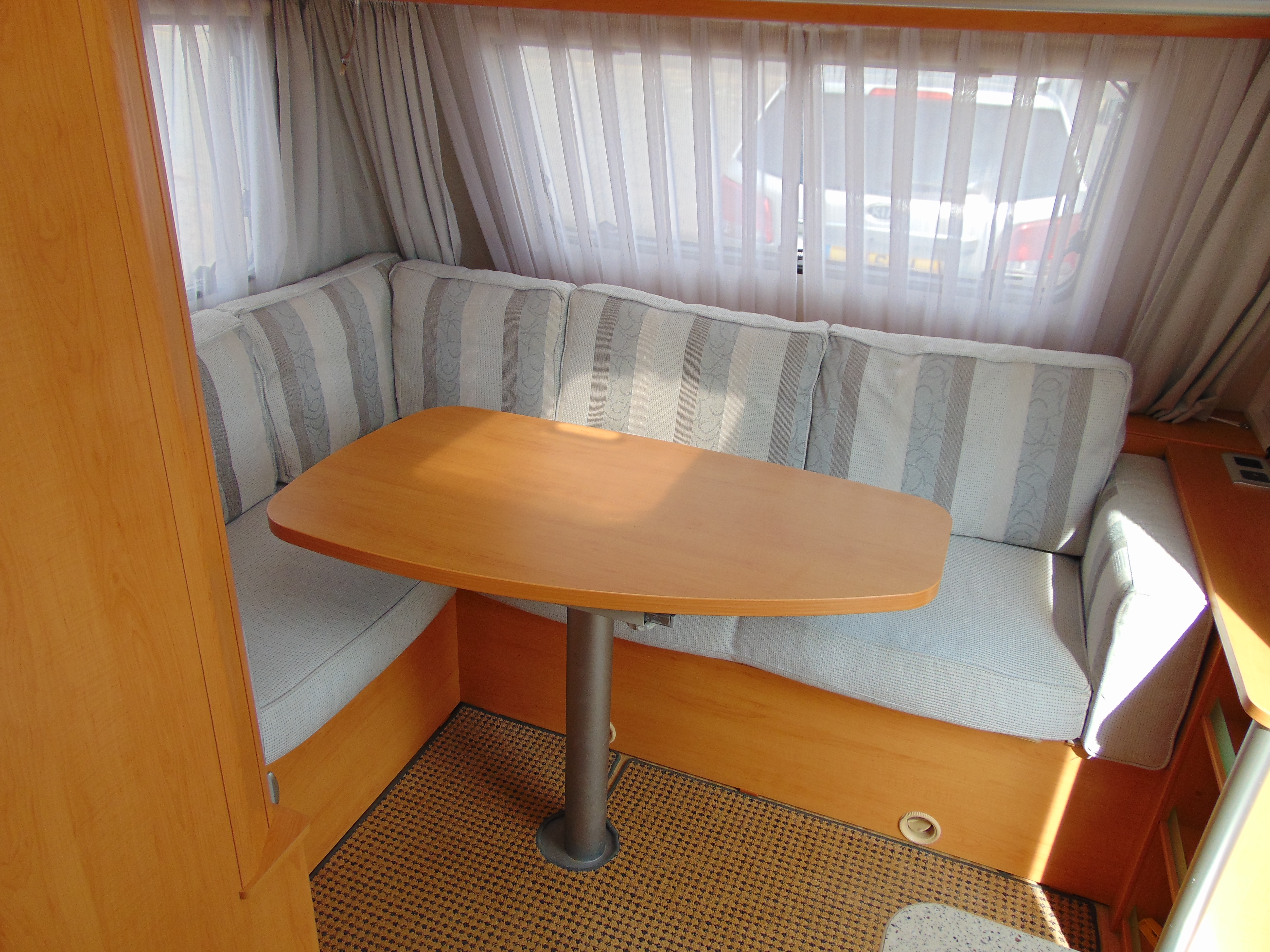 Rear “L” shaped bench seating (storage under) can accommodate a 3rd person. Fixed table, top slides in all directions.