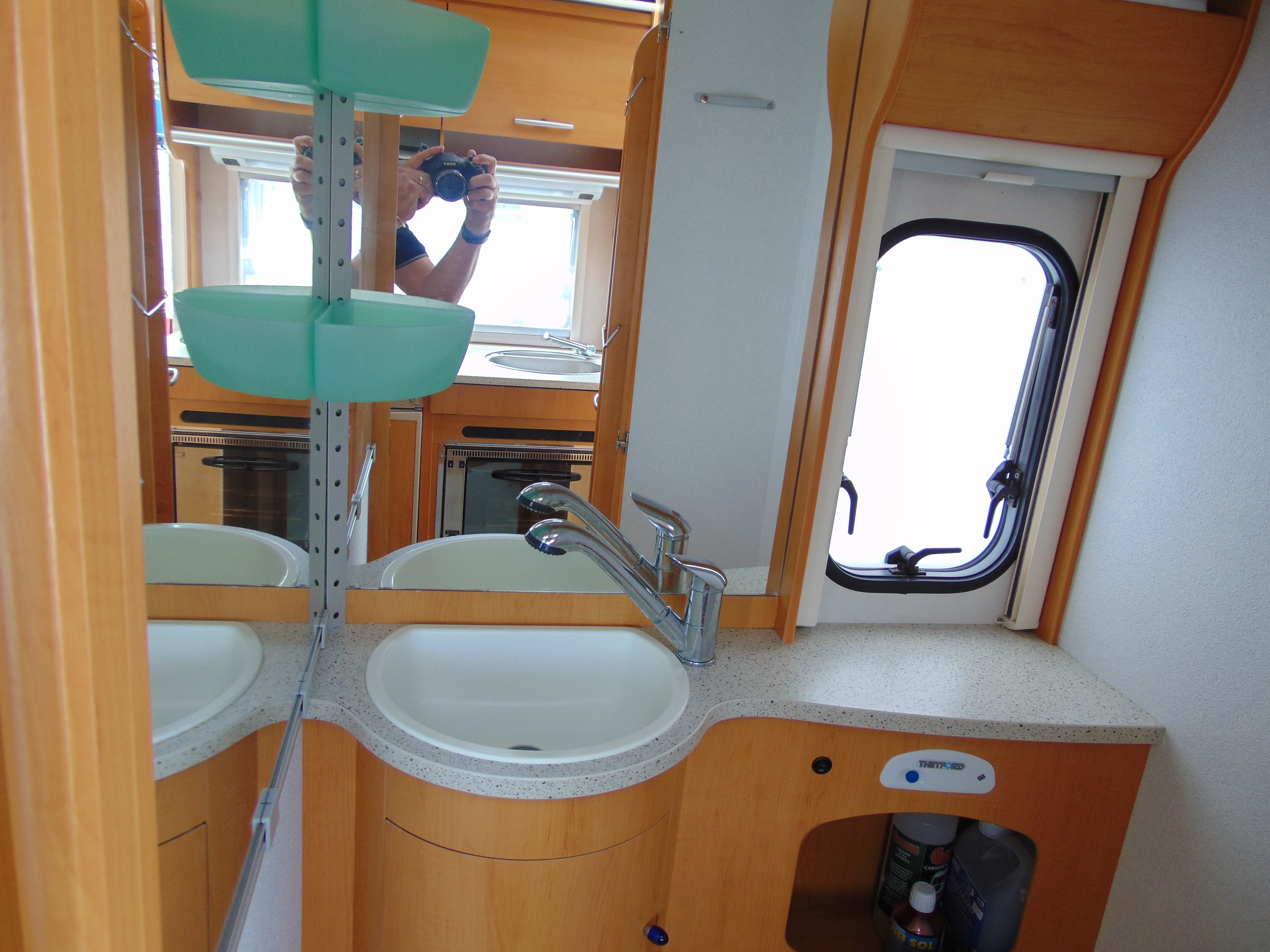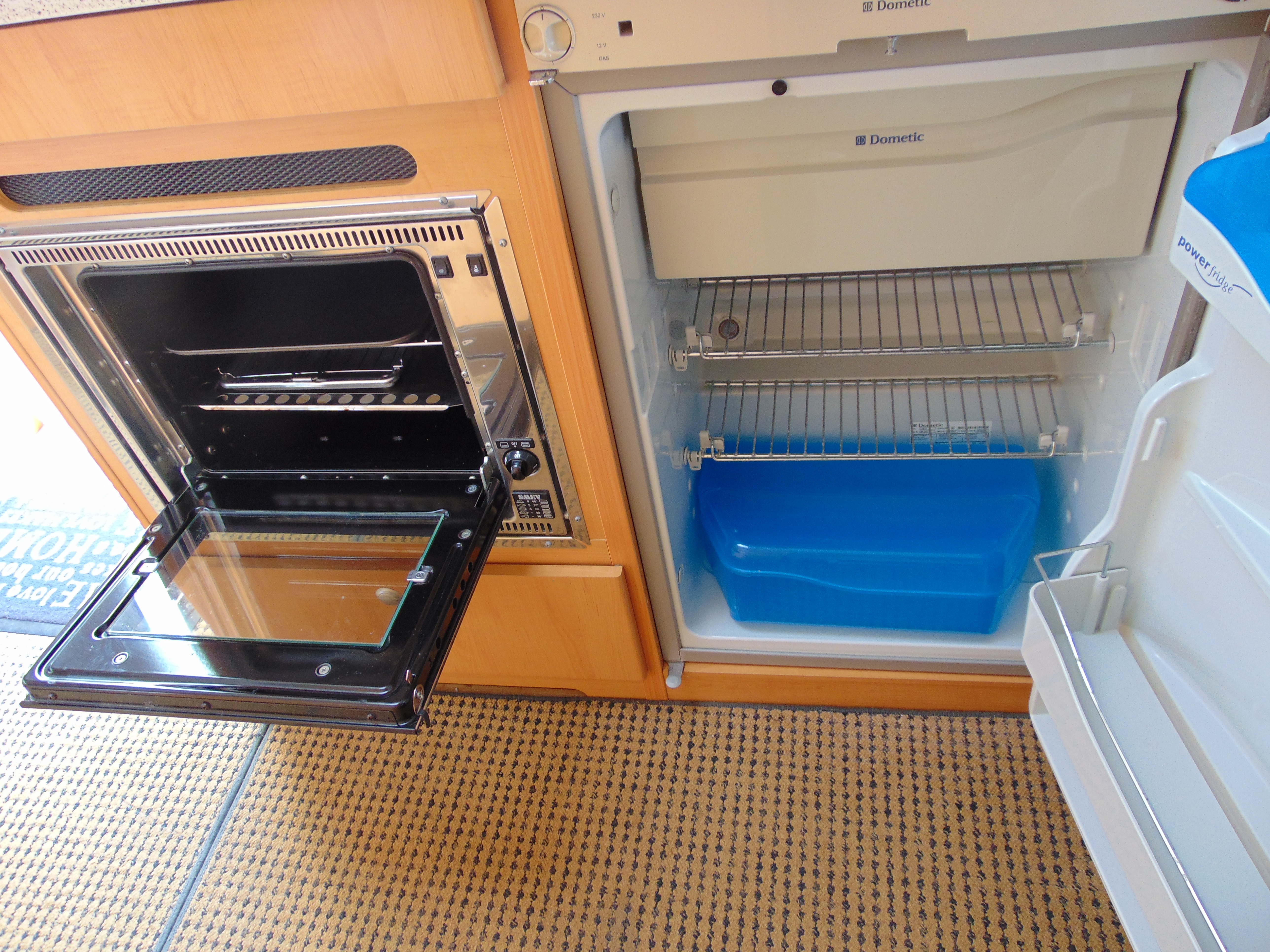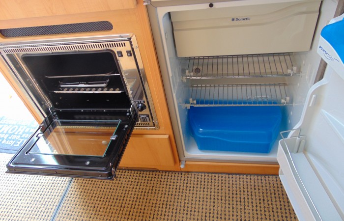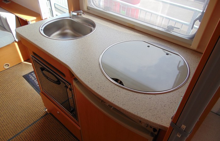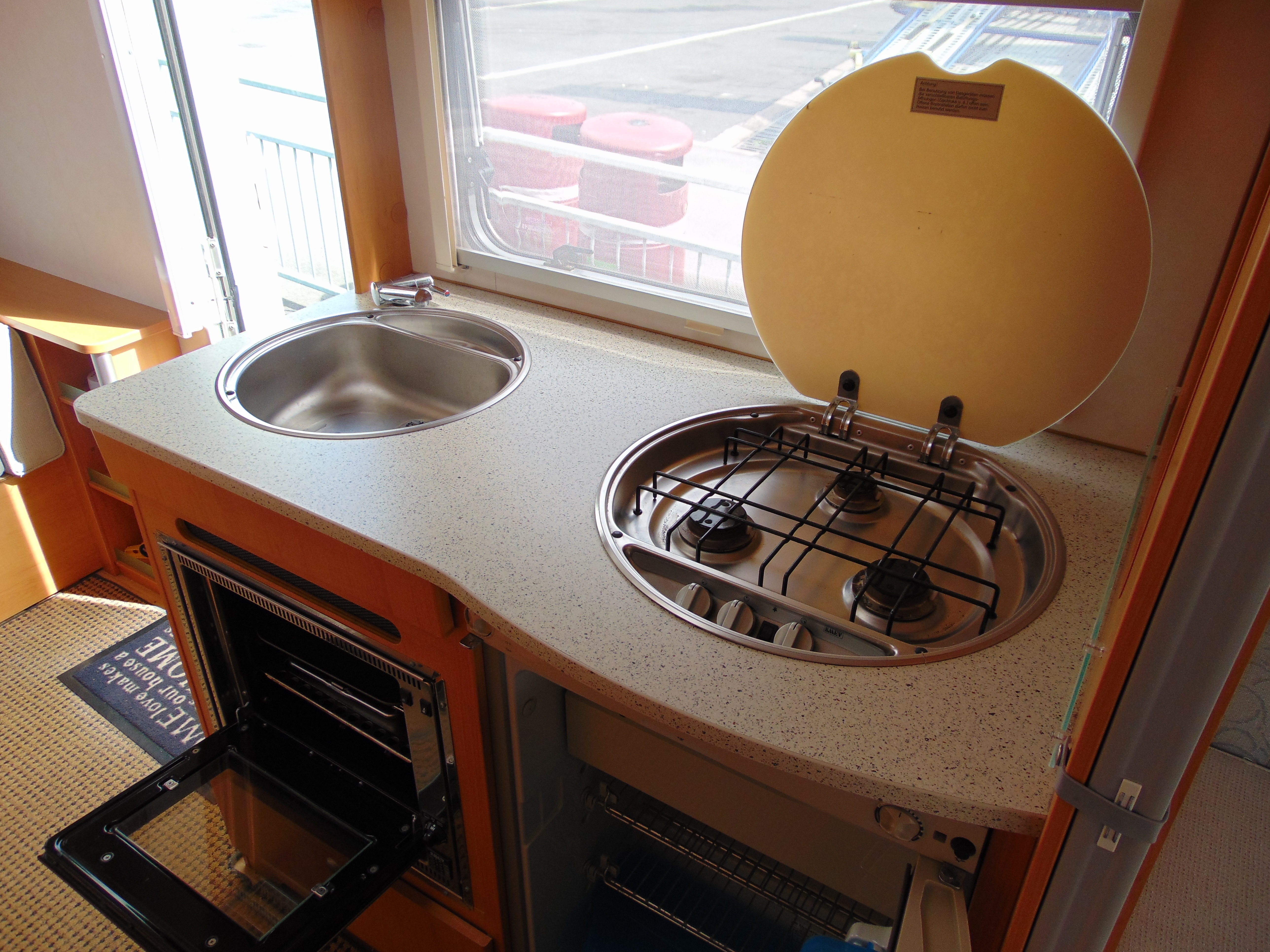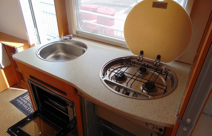 Stainless hob with 3 gas rings, gas oven with grill, stainless sink, 3 way fridge/freezer (gas, 240v & 12v), rangehood extractor.
