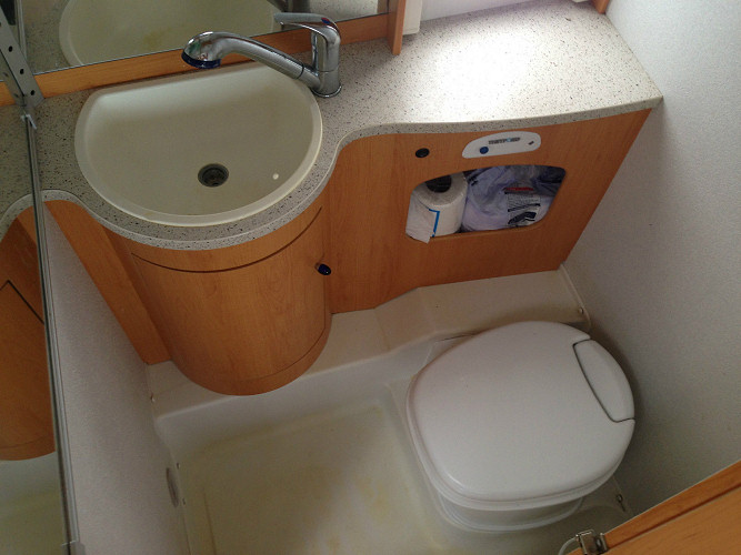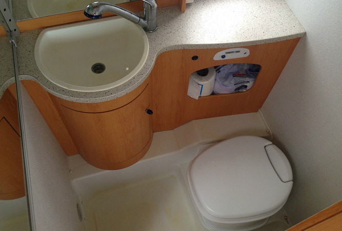 Side washroom with electric flush cassette toilet, shower and hand basin.