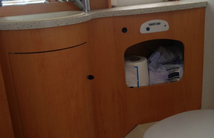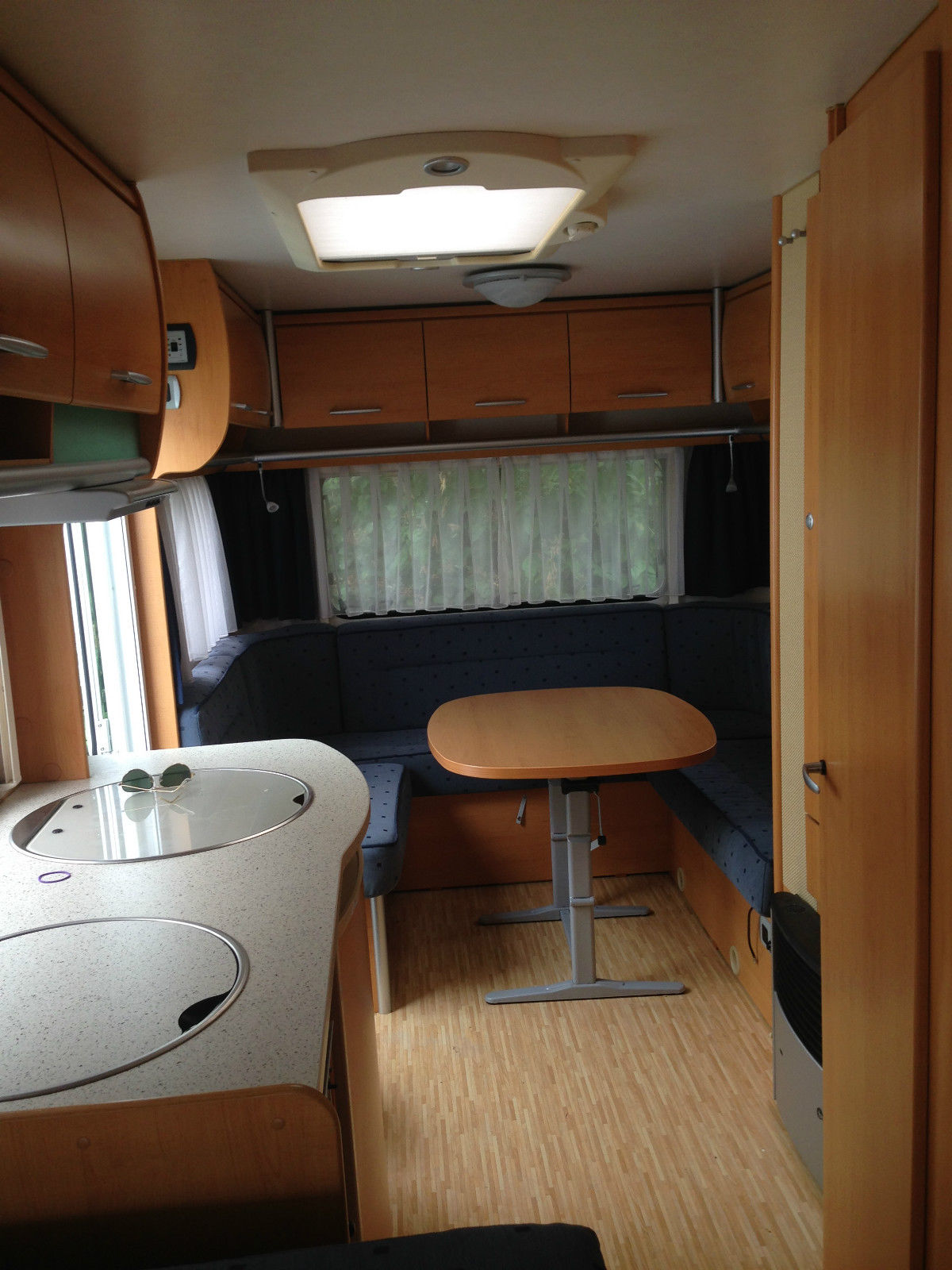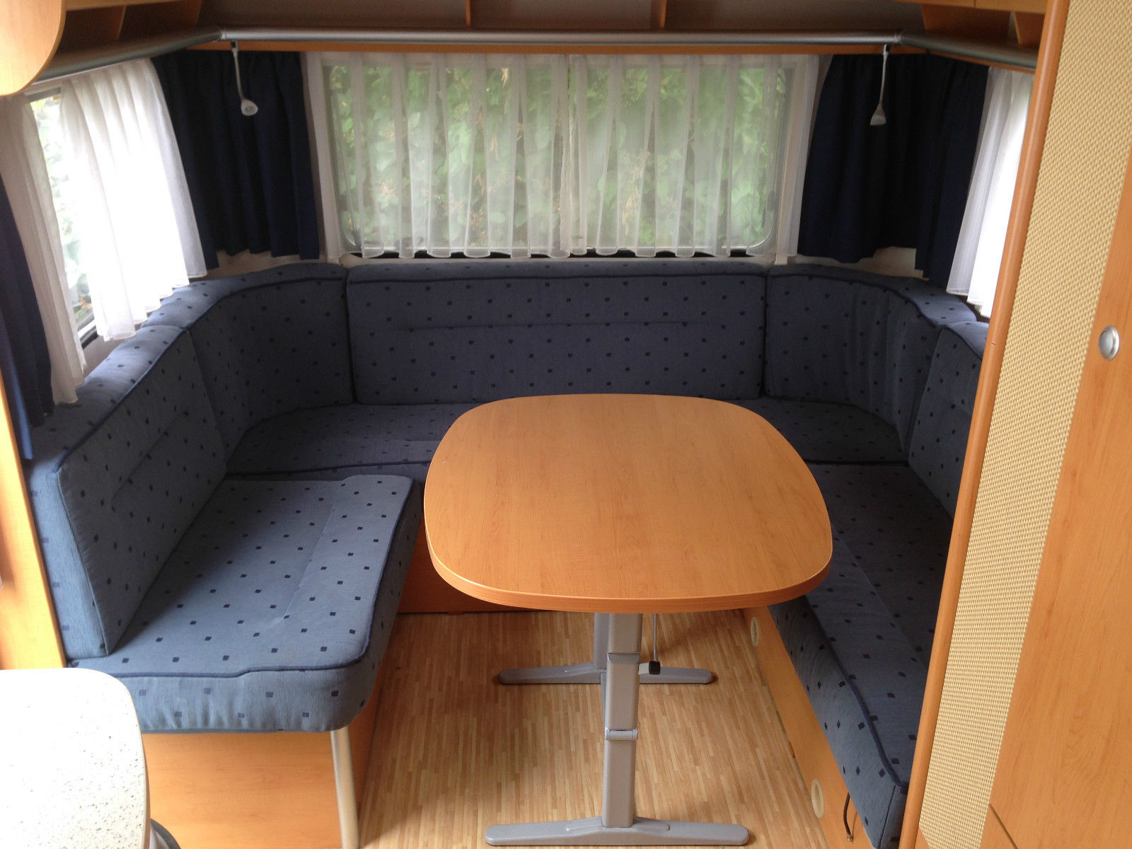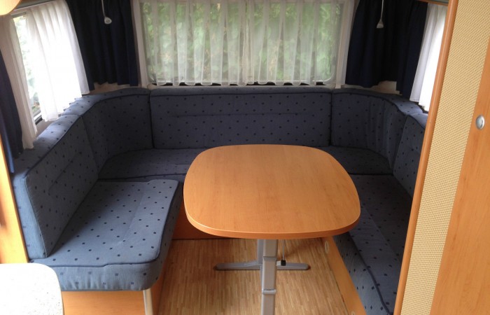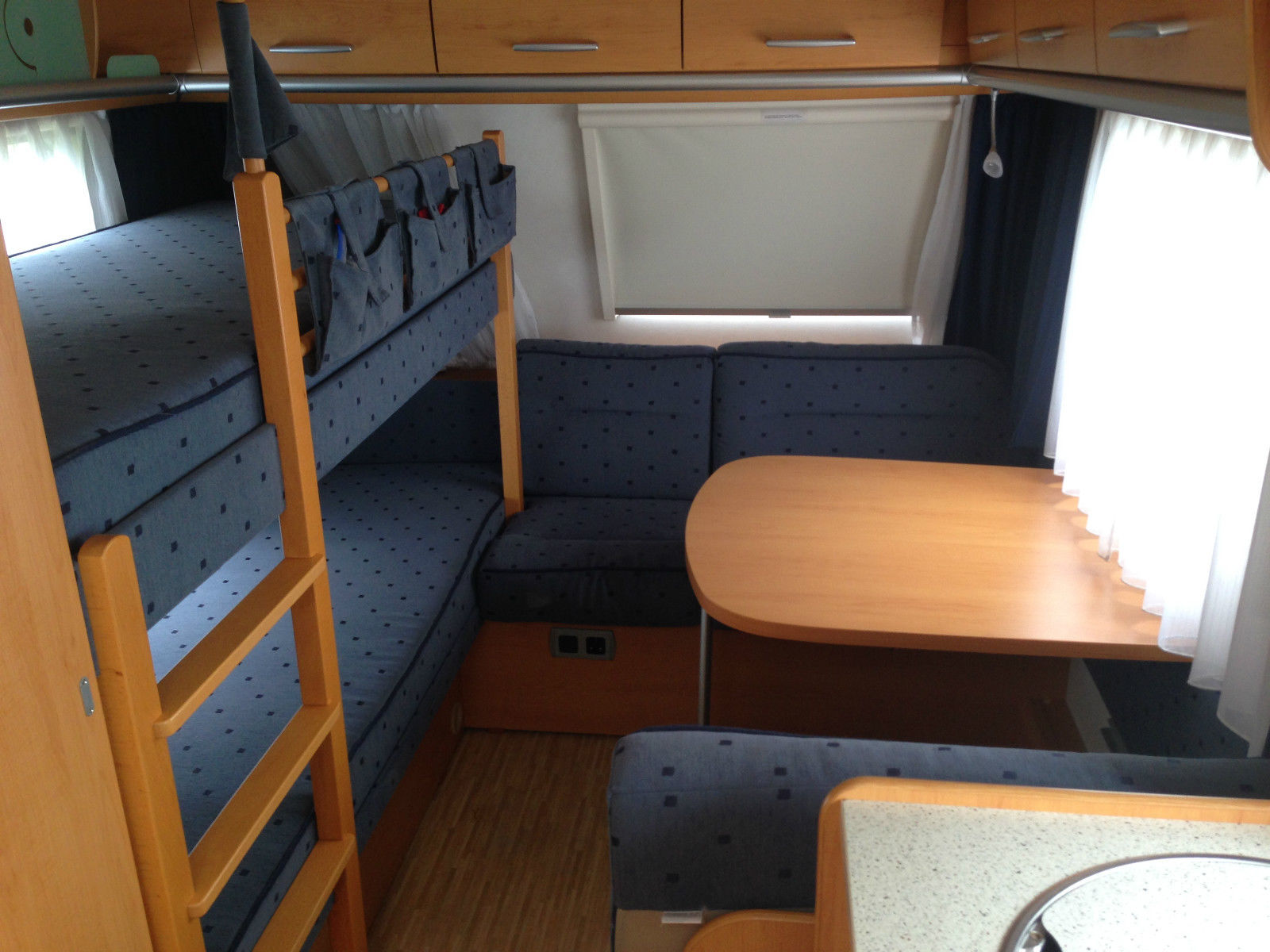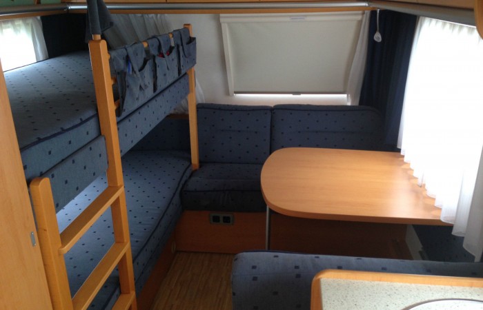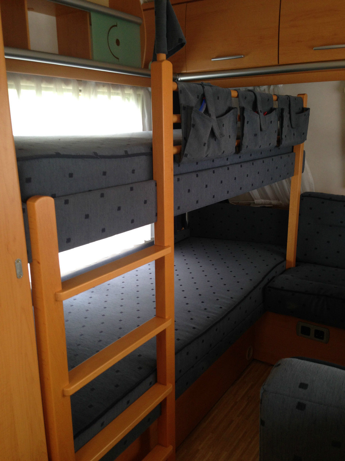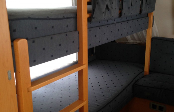 Great layout, with twin fixed bunks and a single using the convertible dinette for the kids, separated by a concertina screen from mum and dad in their double bed converted from the “U” shaped seating at the other end.