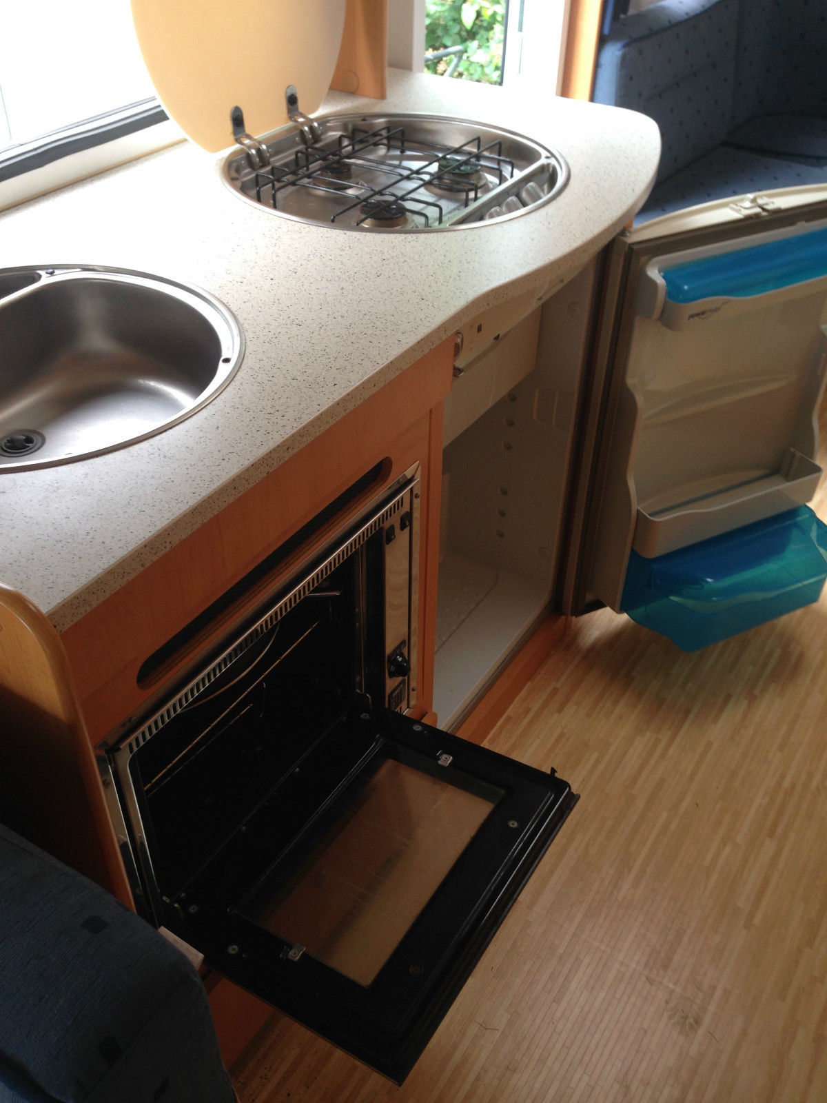 Kitchen includes oven with grill, fridge/freezer, 3 burner gas hob and an extractor fan. Plenty of storage and room for a microwave.