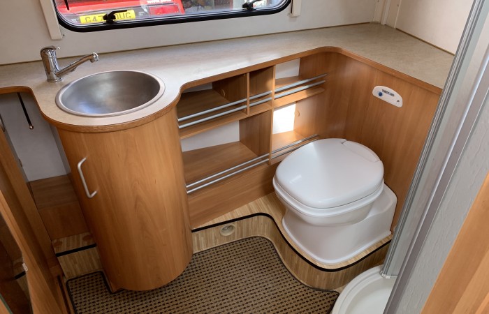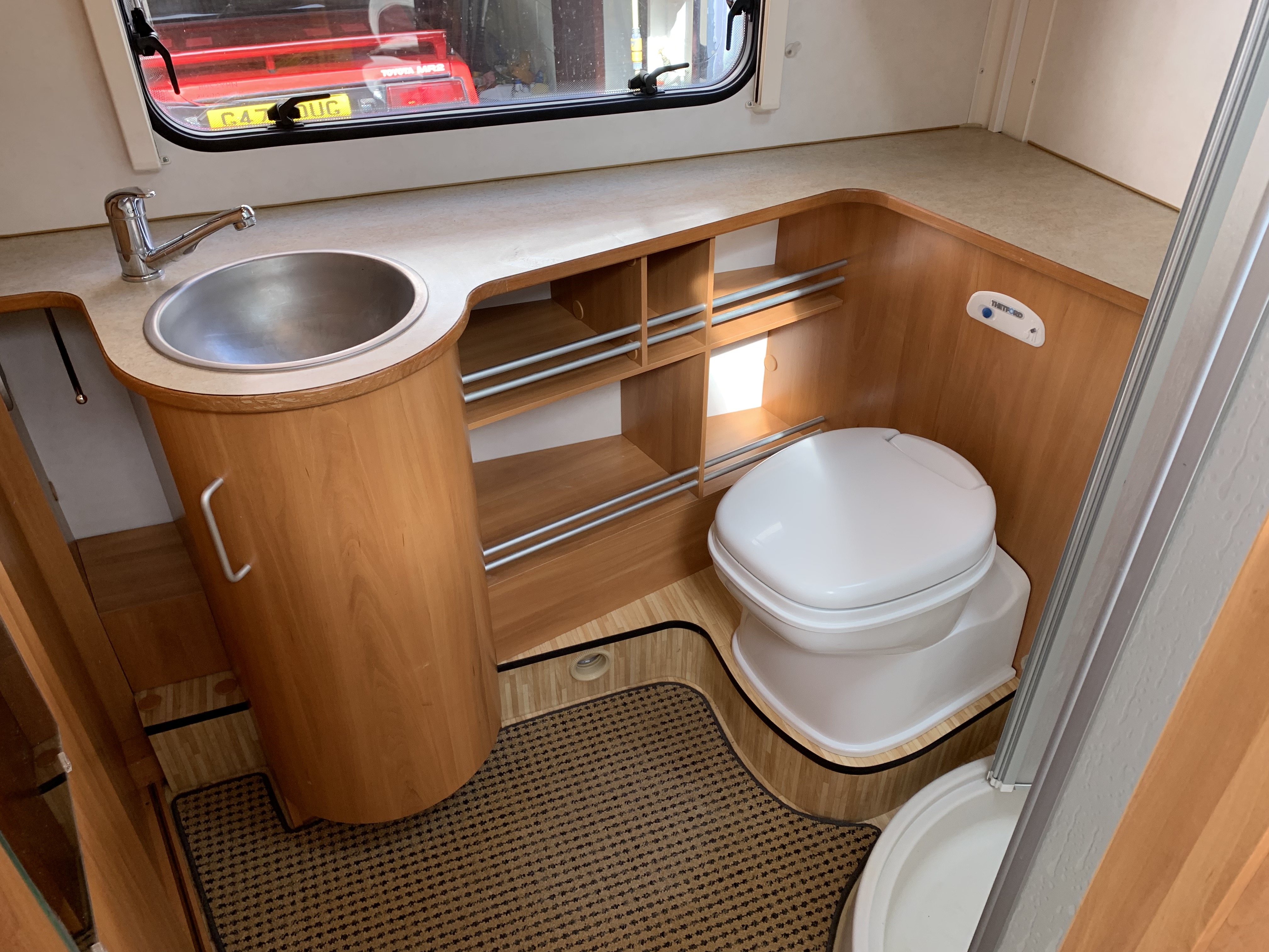 Another beautiful 2 berth Hymer in exceptional condition with a spacious end washroom containing a separate shower cubicle, cassette toilet with electric flush, hand basin and a large wardrobe.