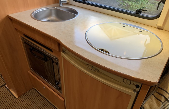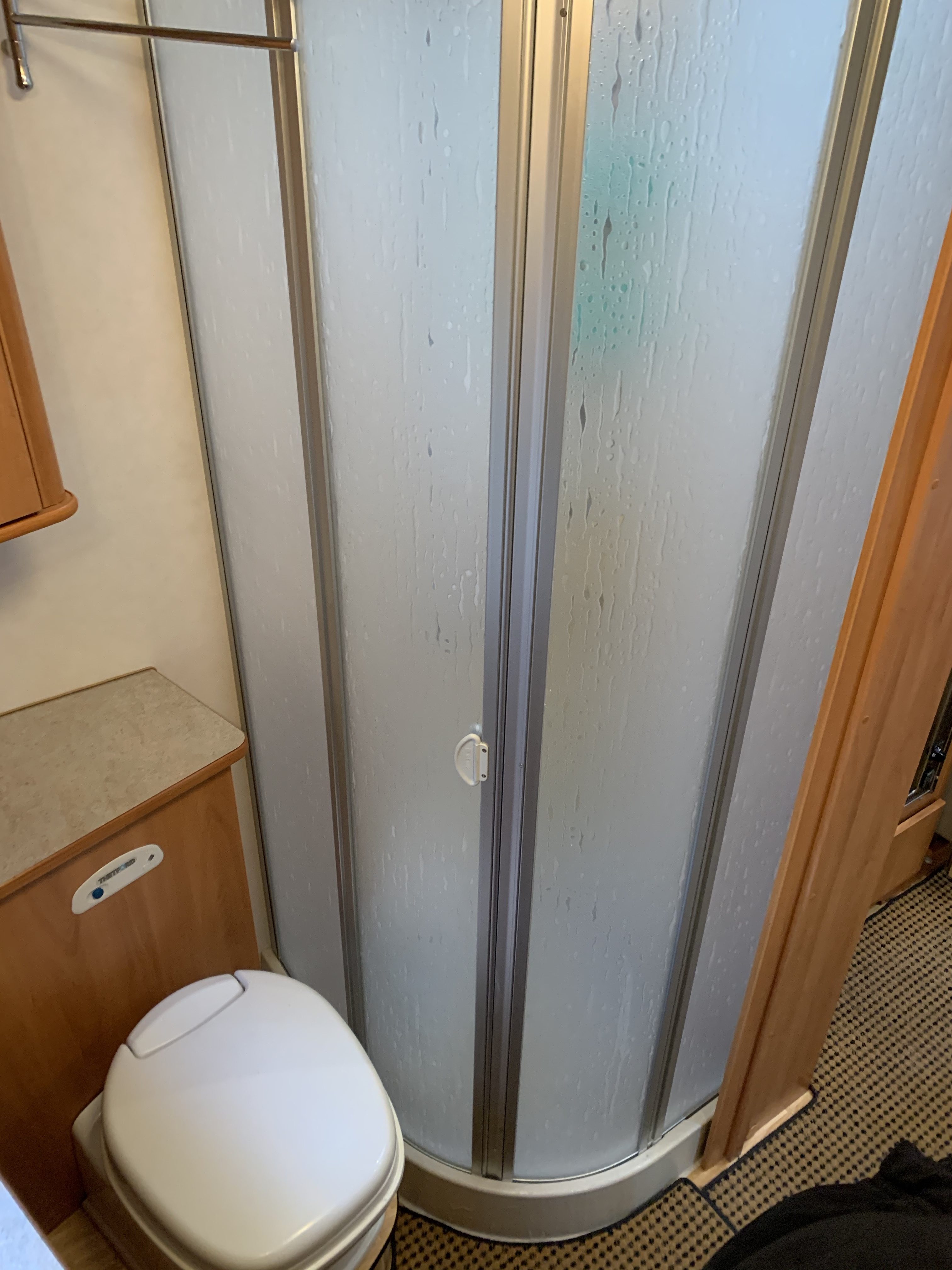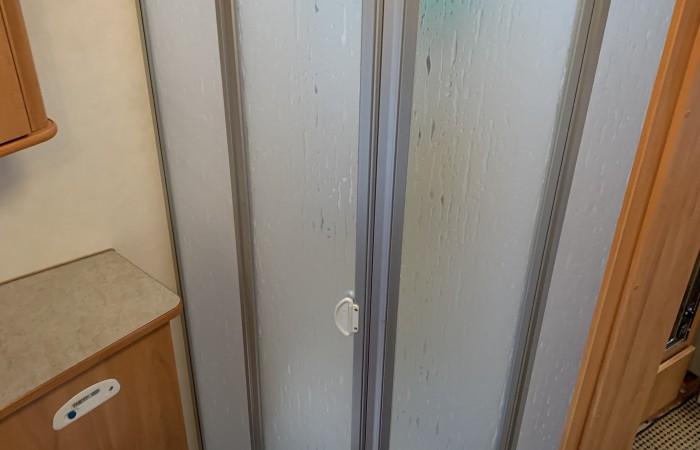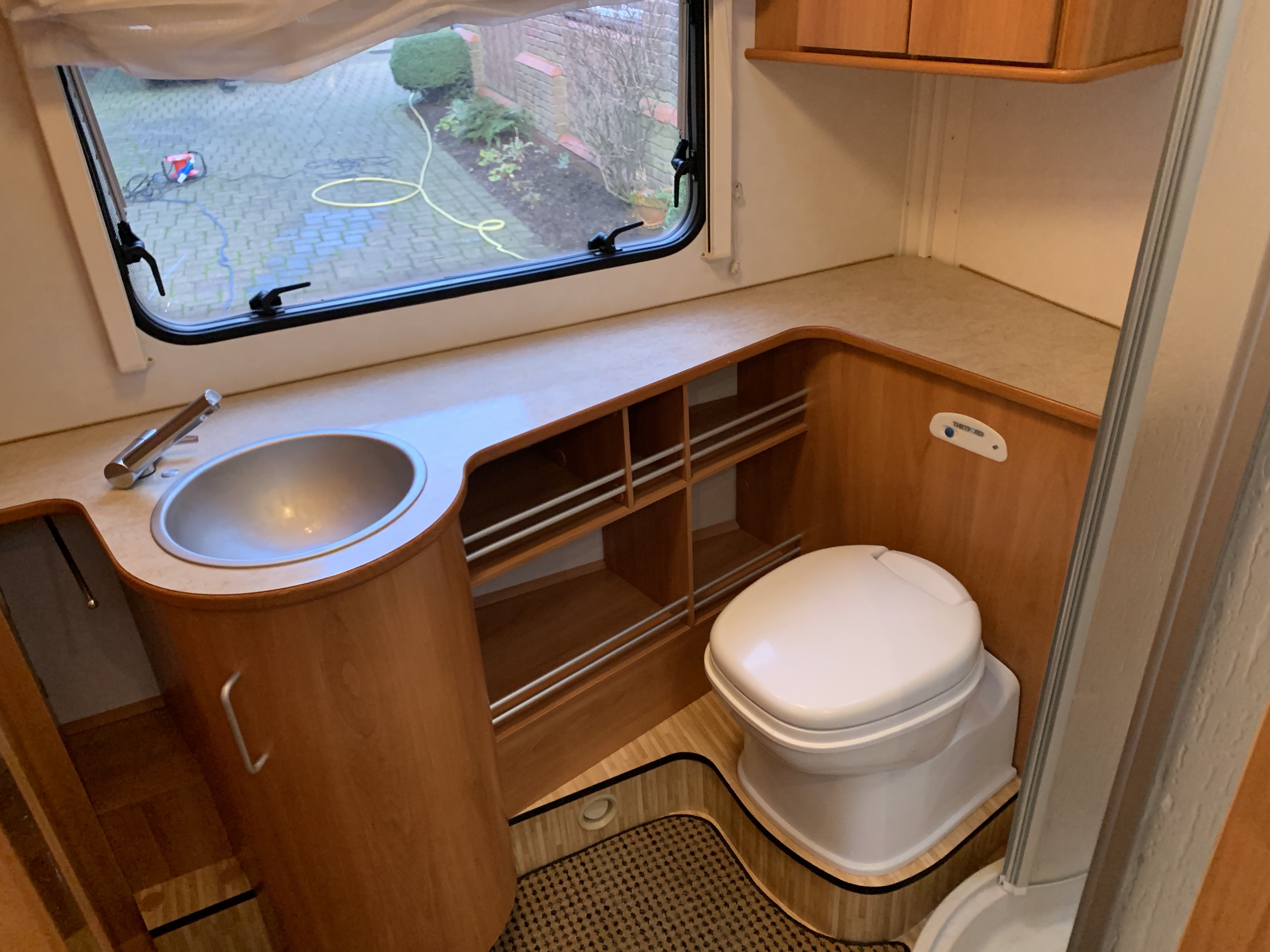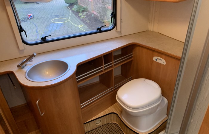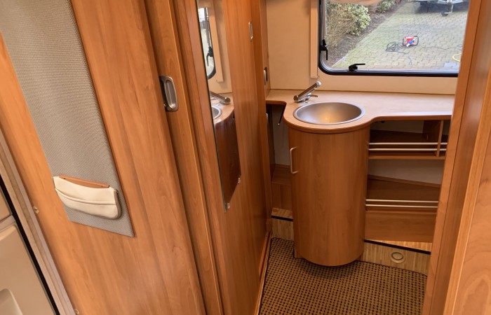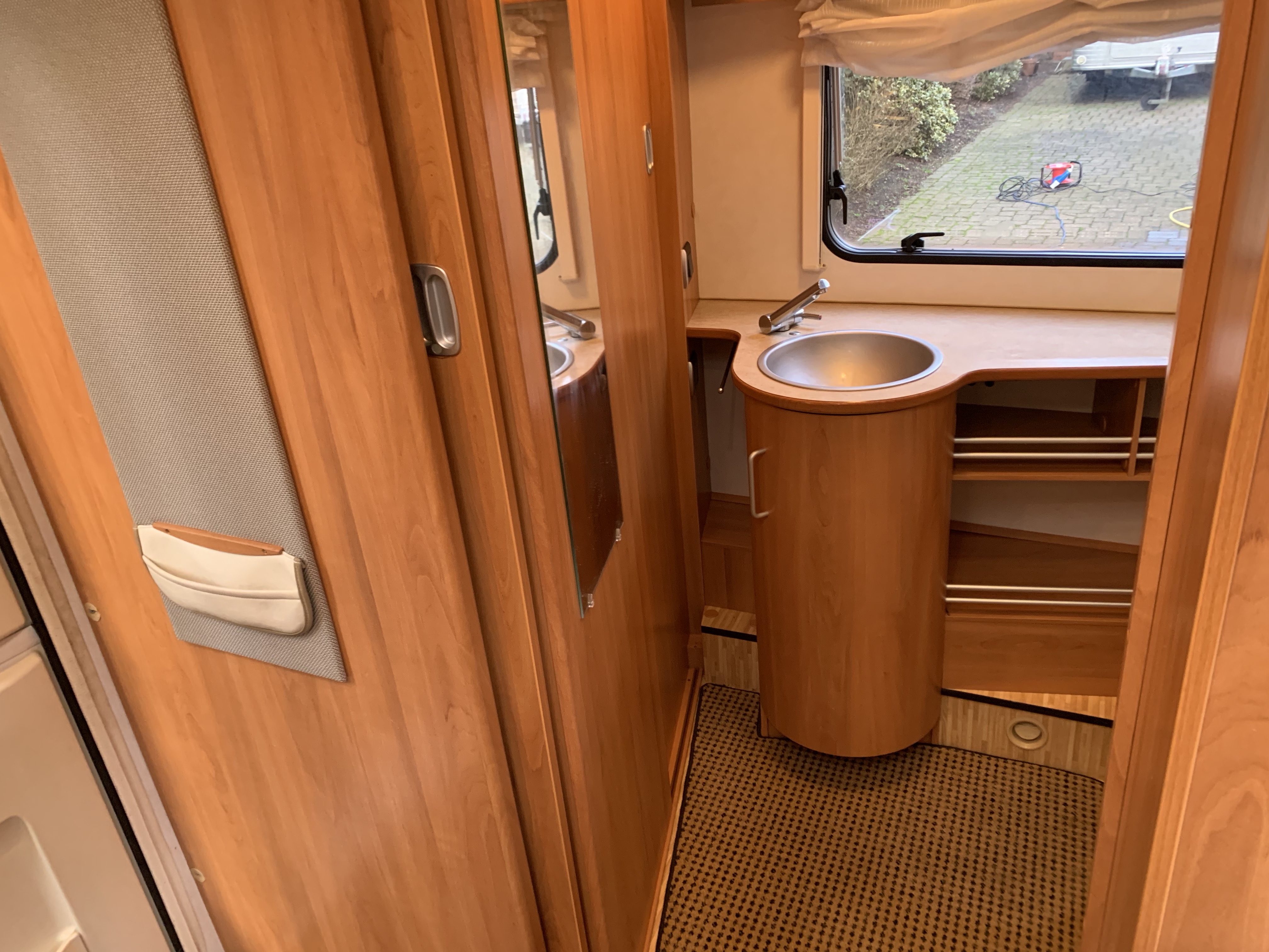 This well cared for 2 berth Hymer has a spacious end washroom containing a separate shower cubicle, cassette toilet with electric flush, hand basin and a large wardrobe.