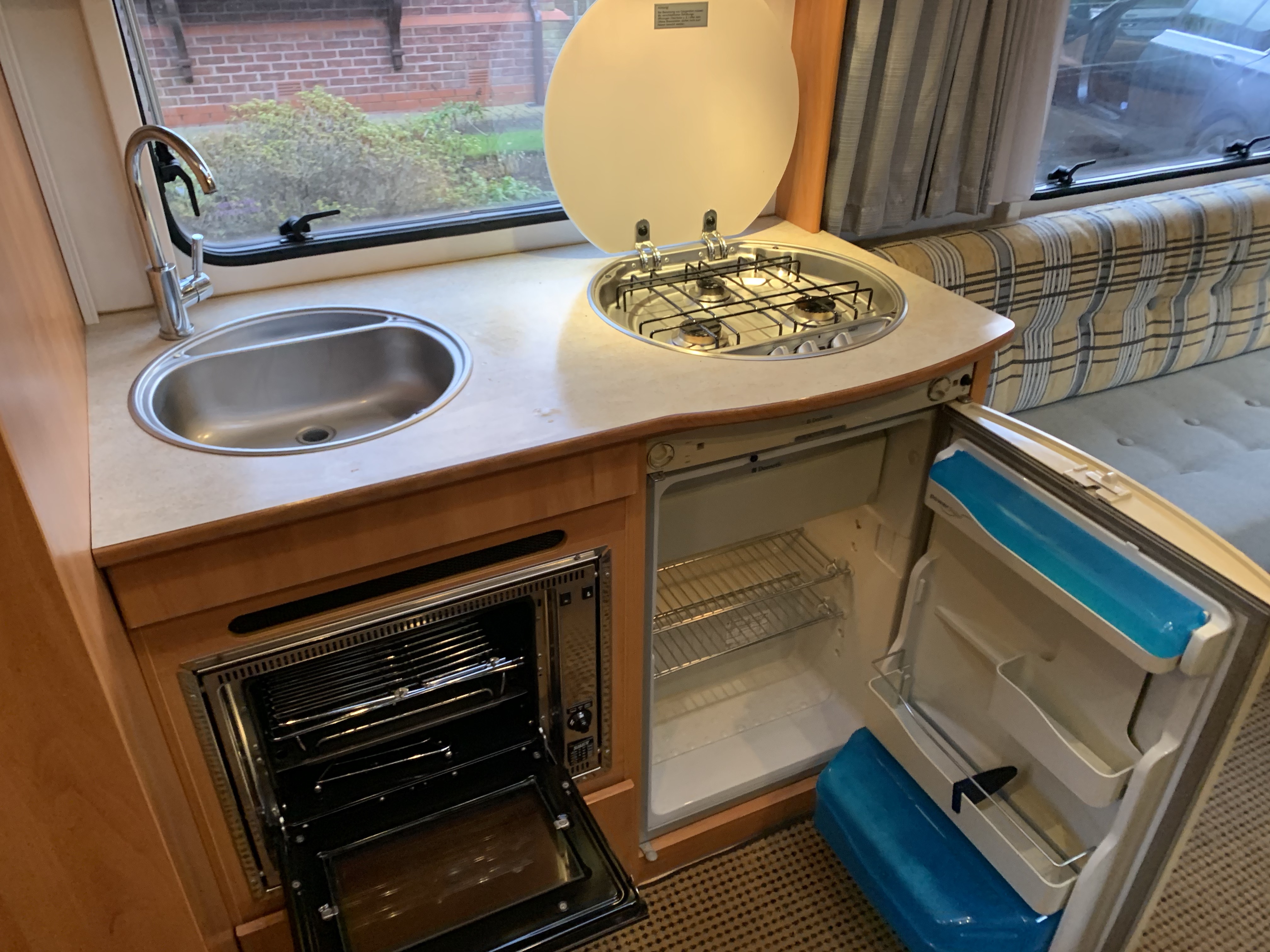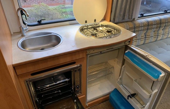 The kitchen houses an oven, grill, fridge/freezer, 3 burner gas hob and an extractor fan. Plenty of storage and room for a microwave.