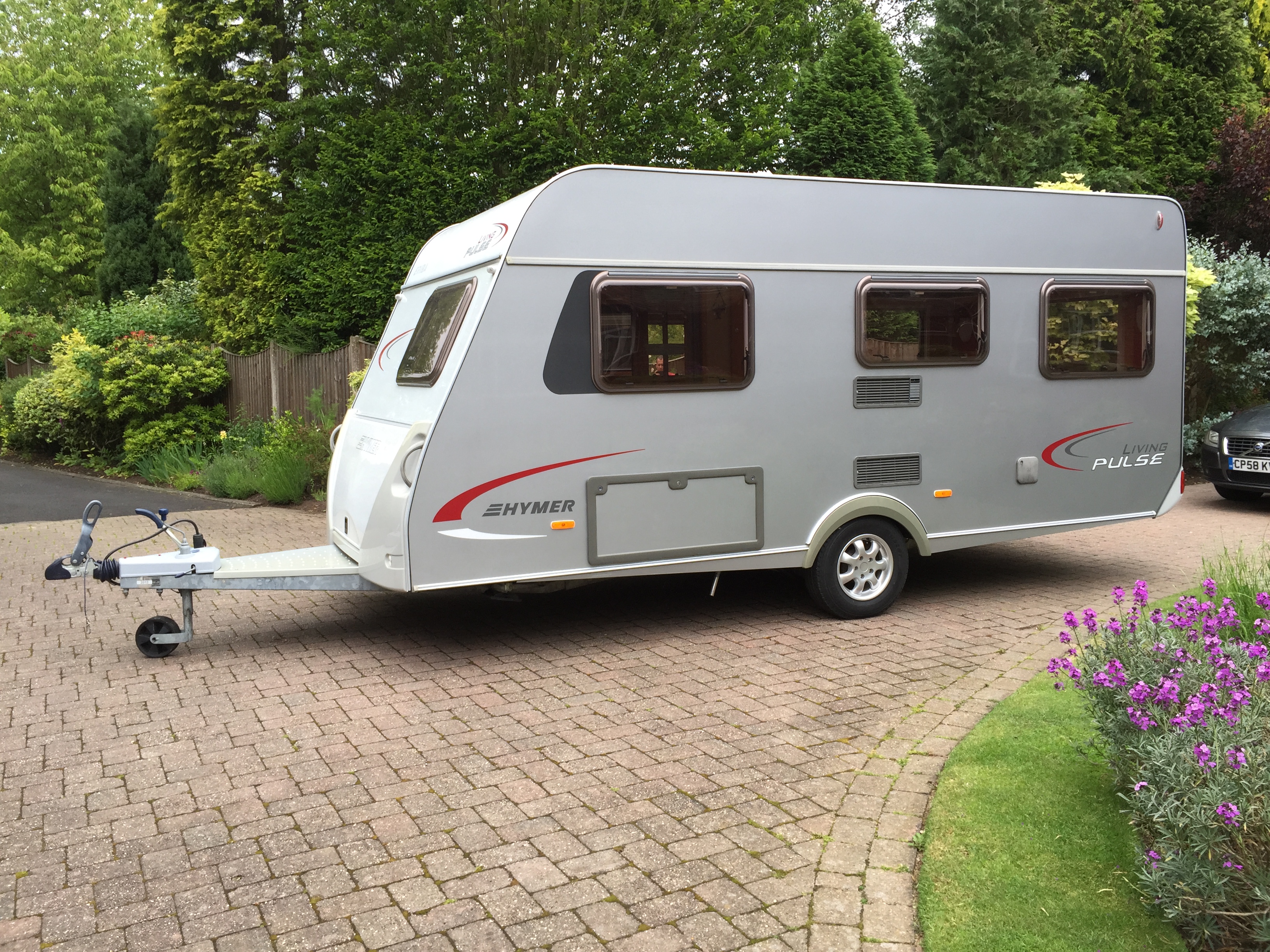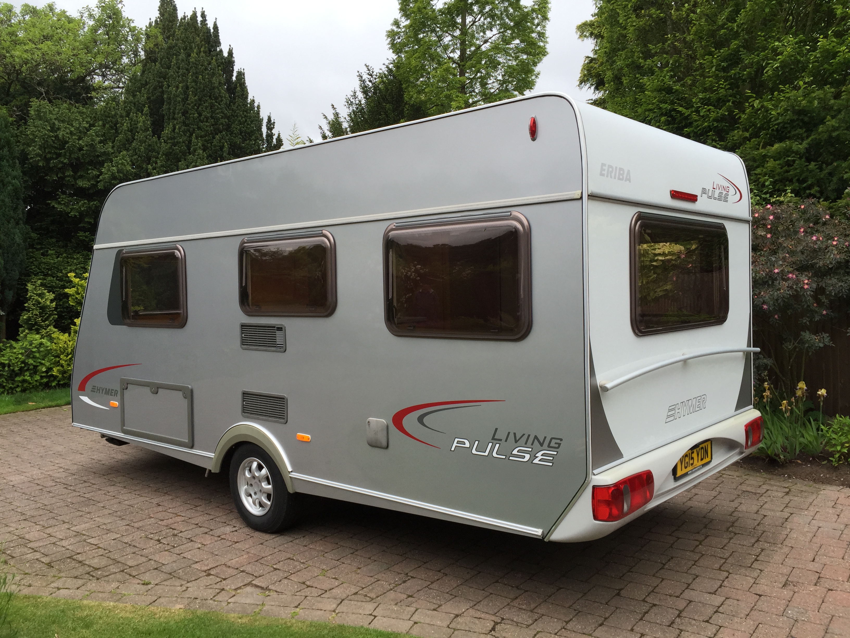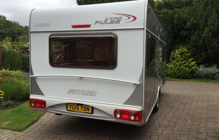 A beautiful 4 berth Hymer with silver and white sides offering a fixed double bed and rear wrap around seating.