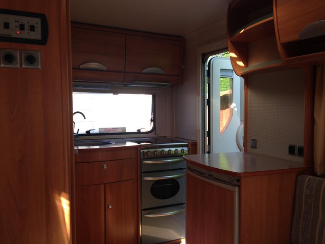 The end kitchen includes a full oven with grill, fridge/freezer, 4 burner gas hob and an extractor fan. Plenty of storage and room for a microwave.