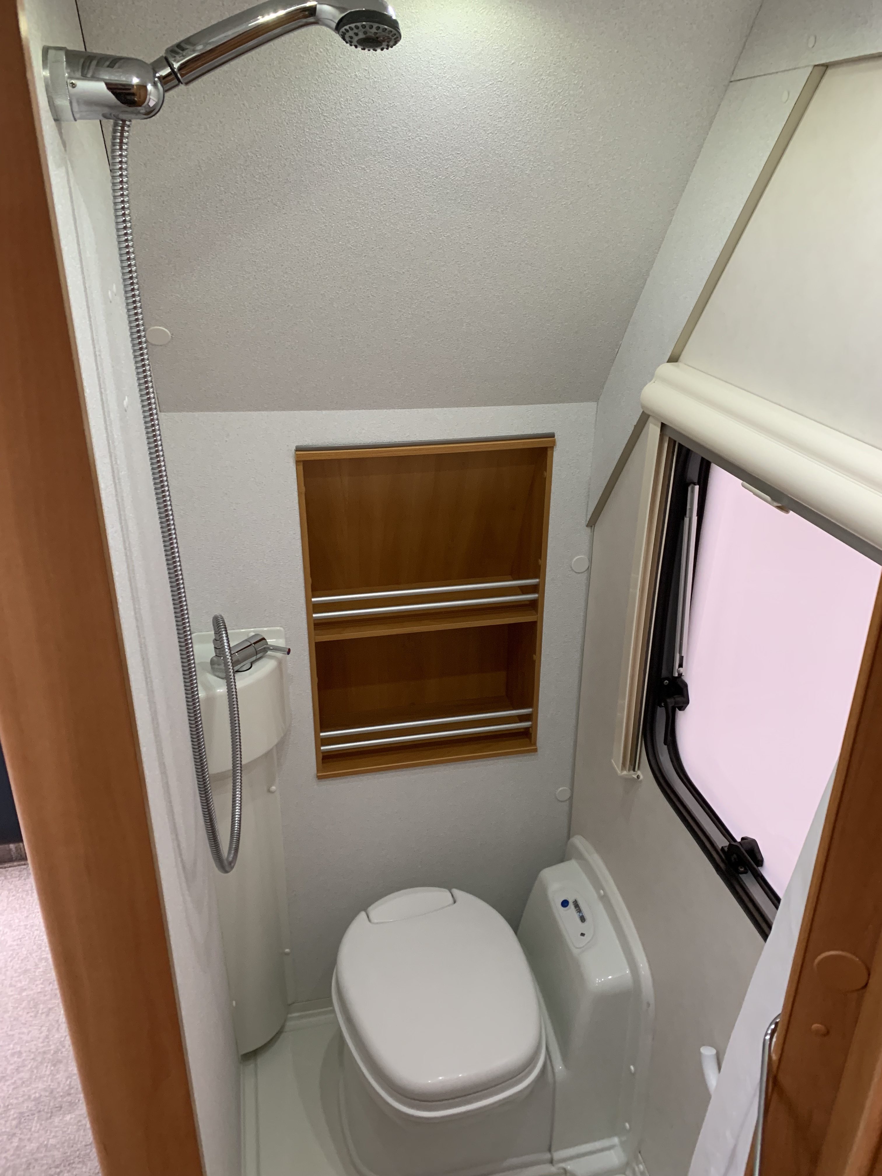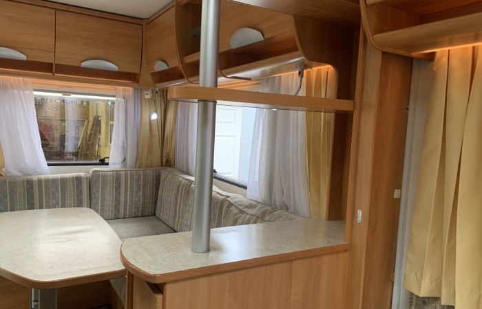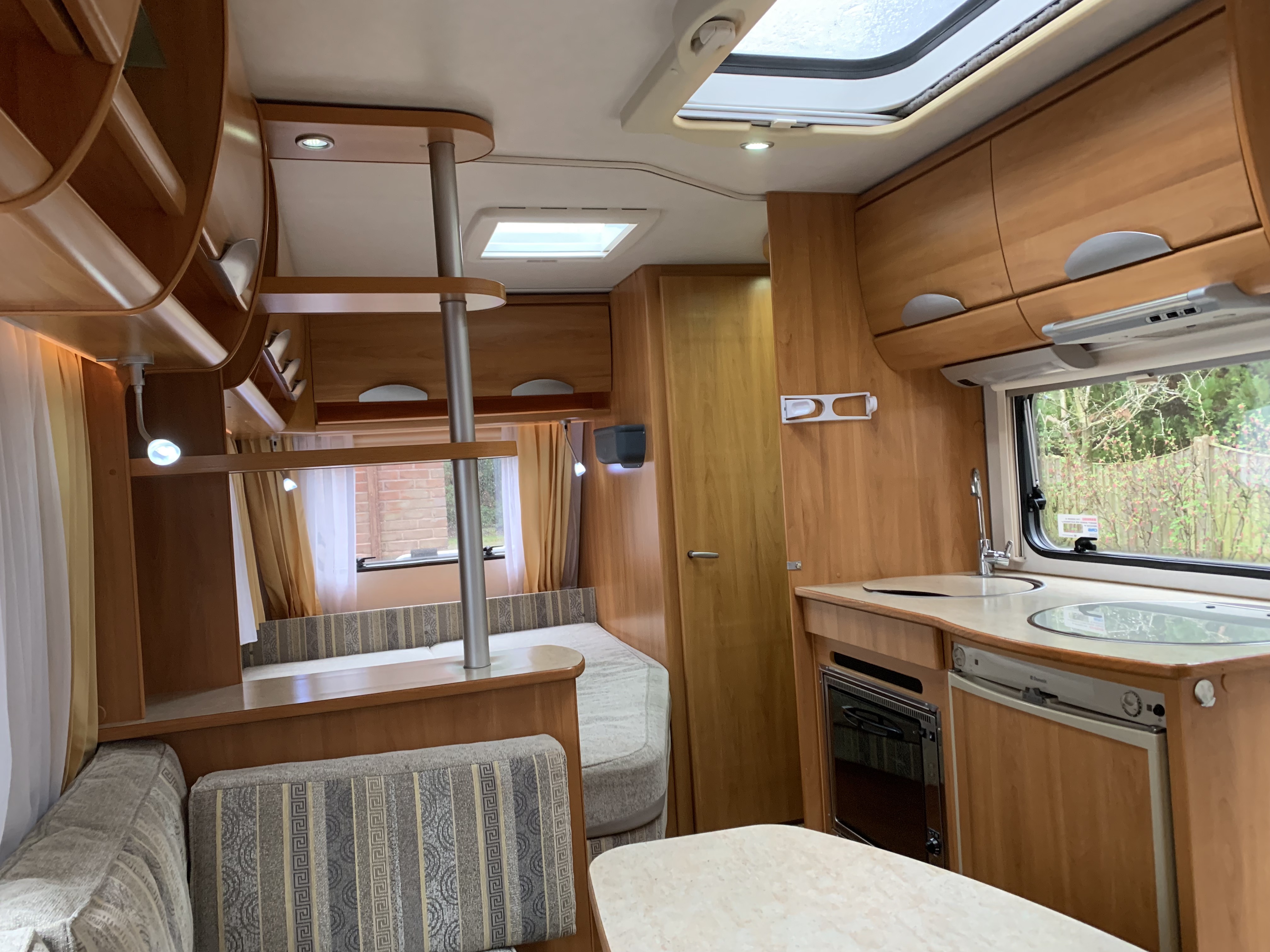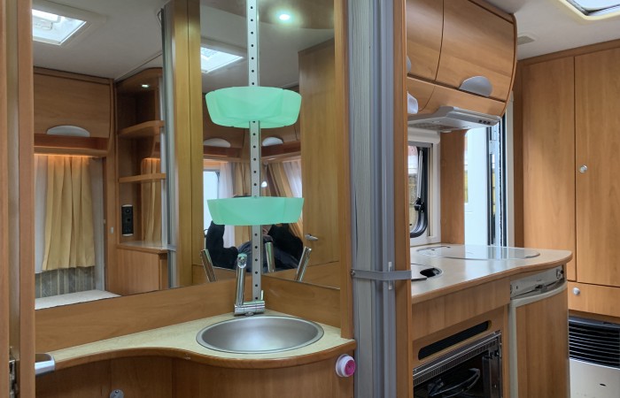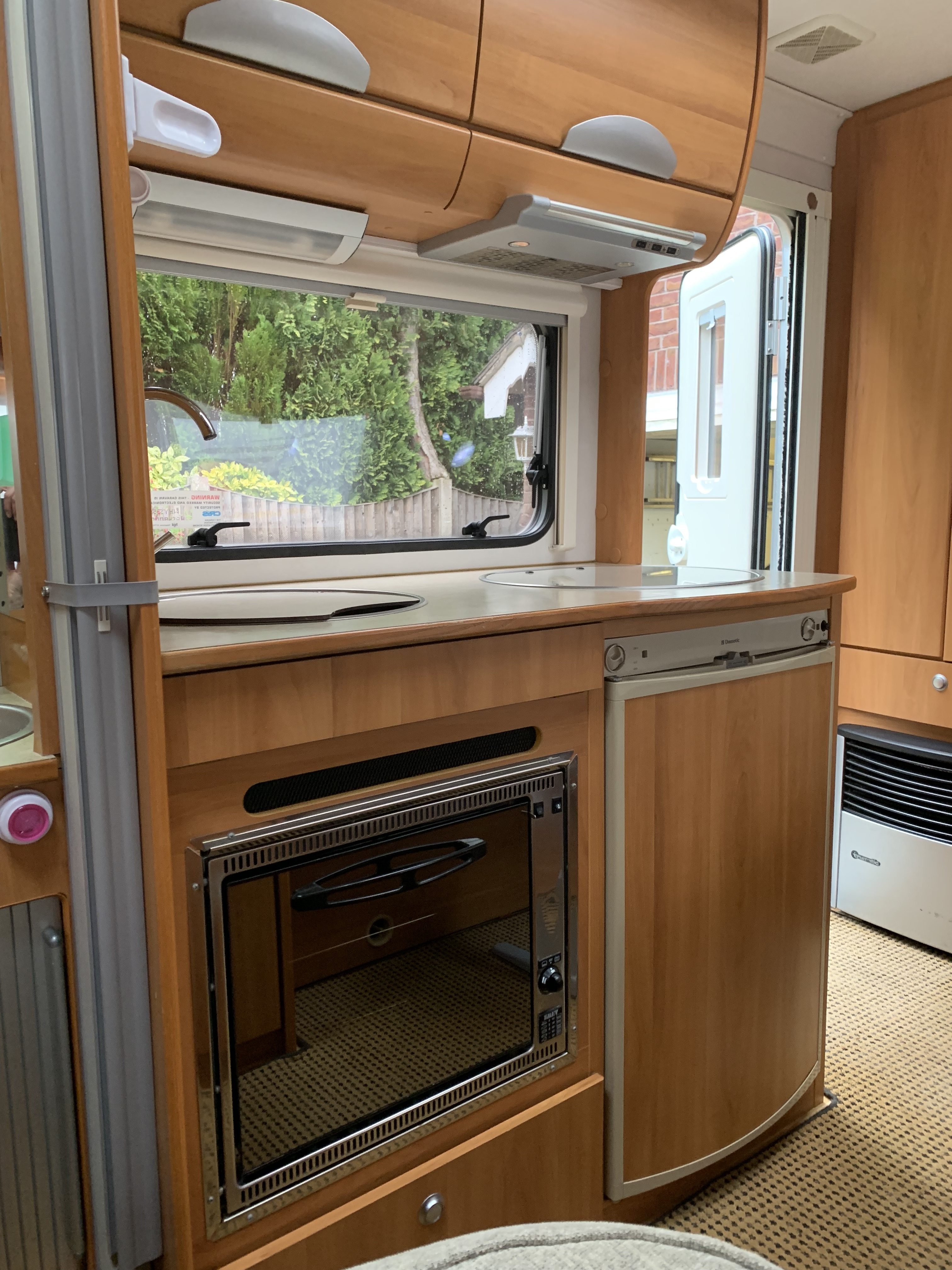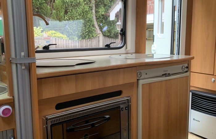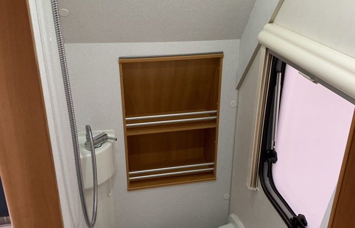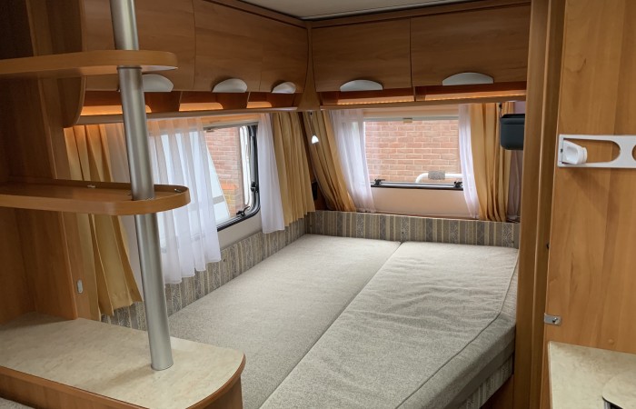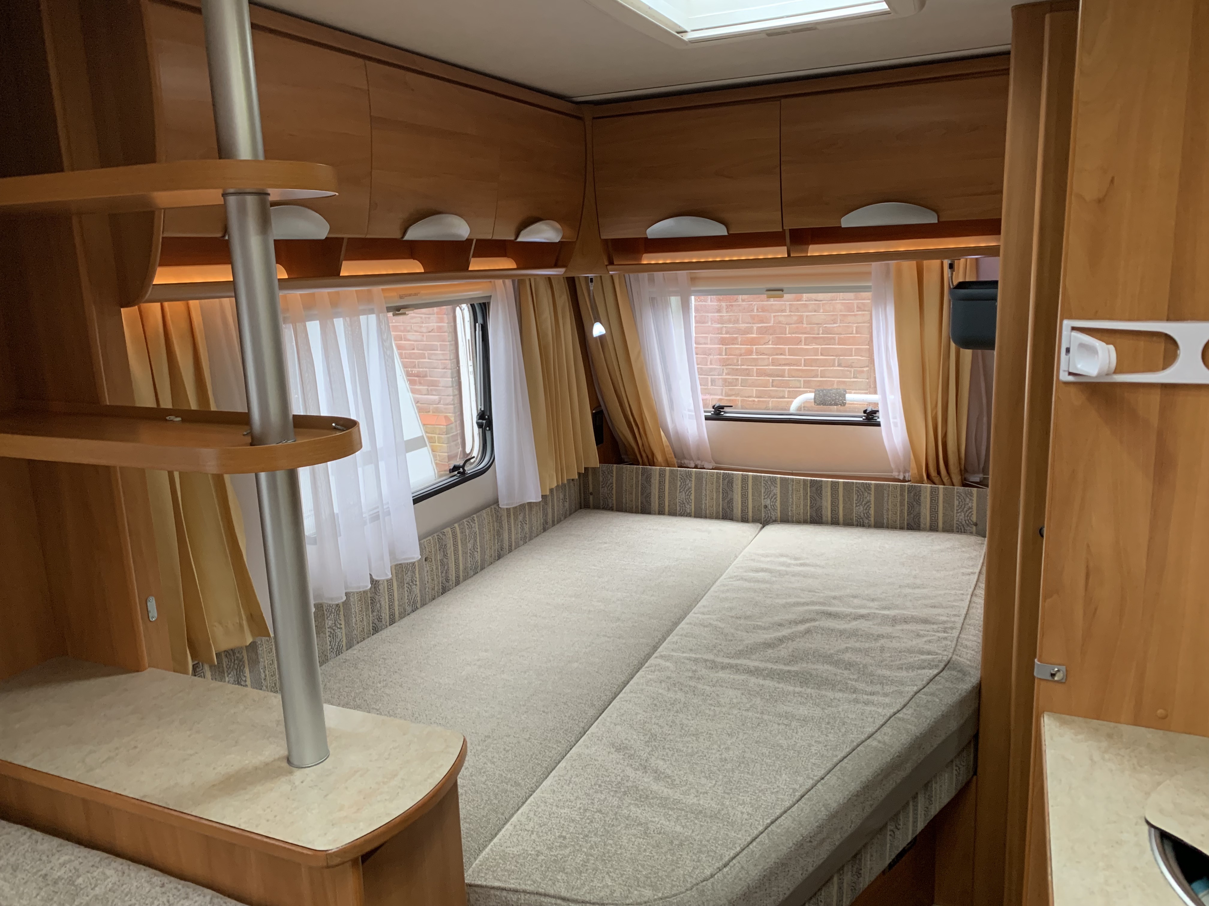 In exceptional condition this compact fixed bed German caravan has an “L” shaped lounge at the rear a washroom with a good size shower, electric flush cassette toilet and separate hand basin.