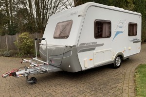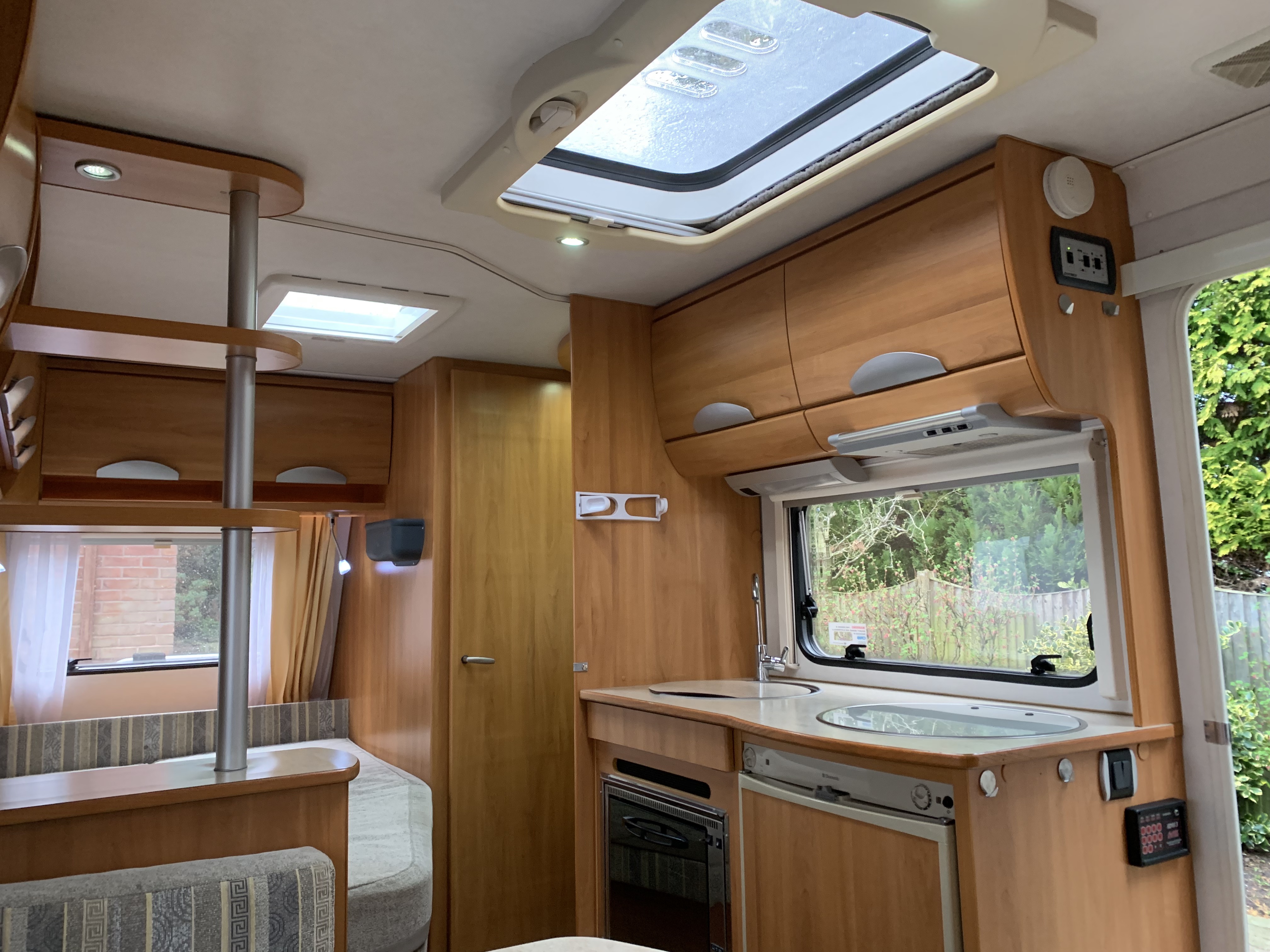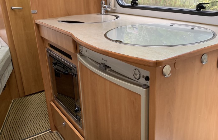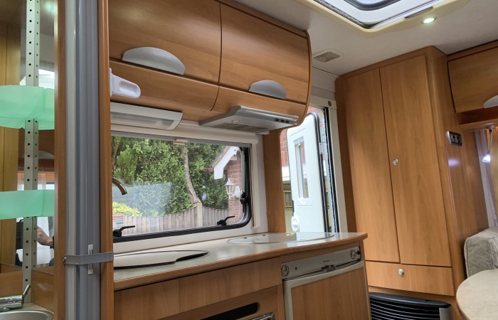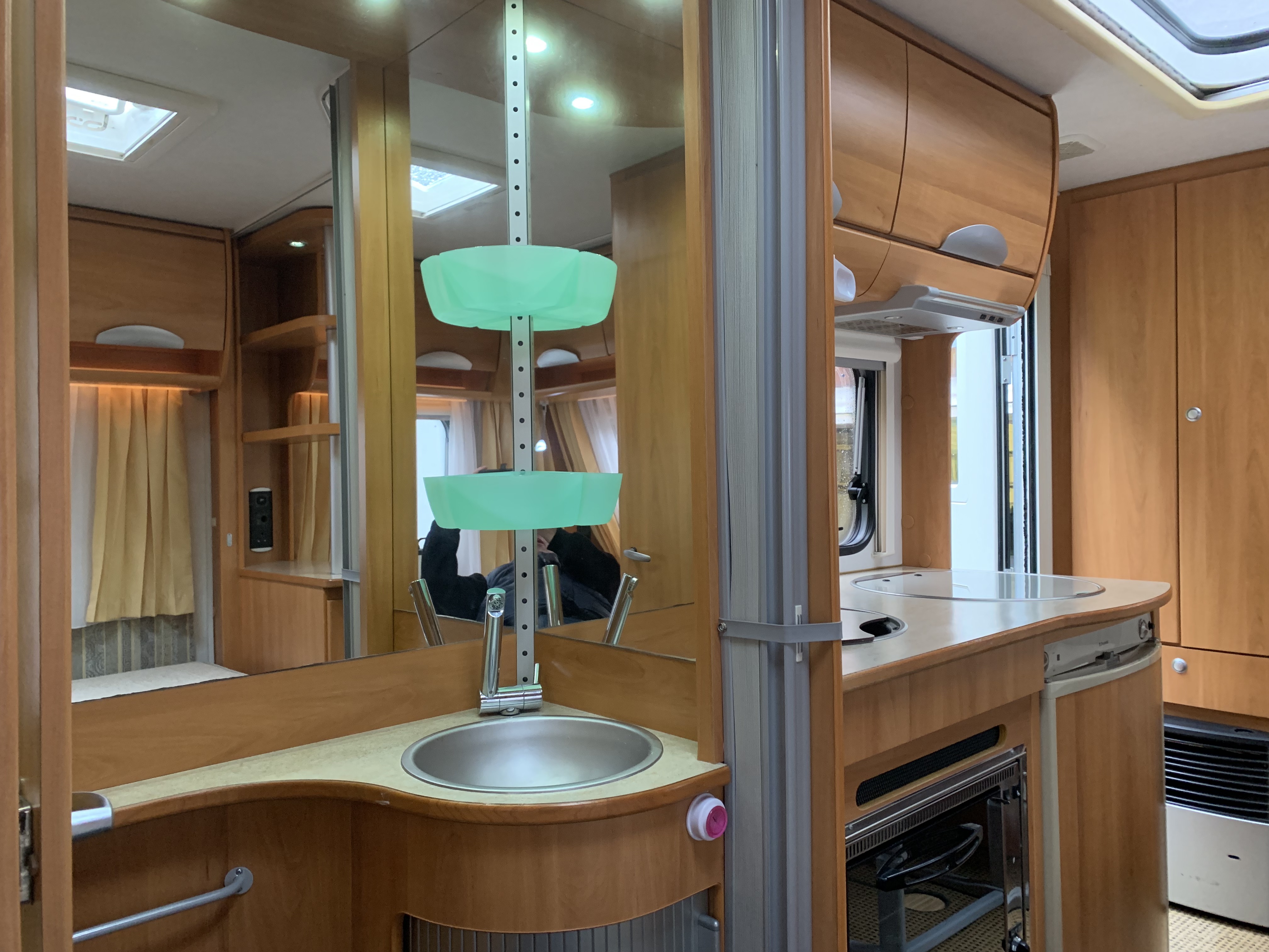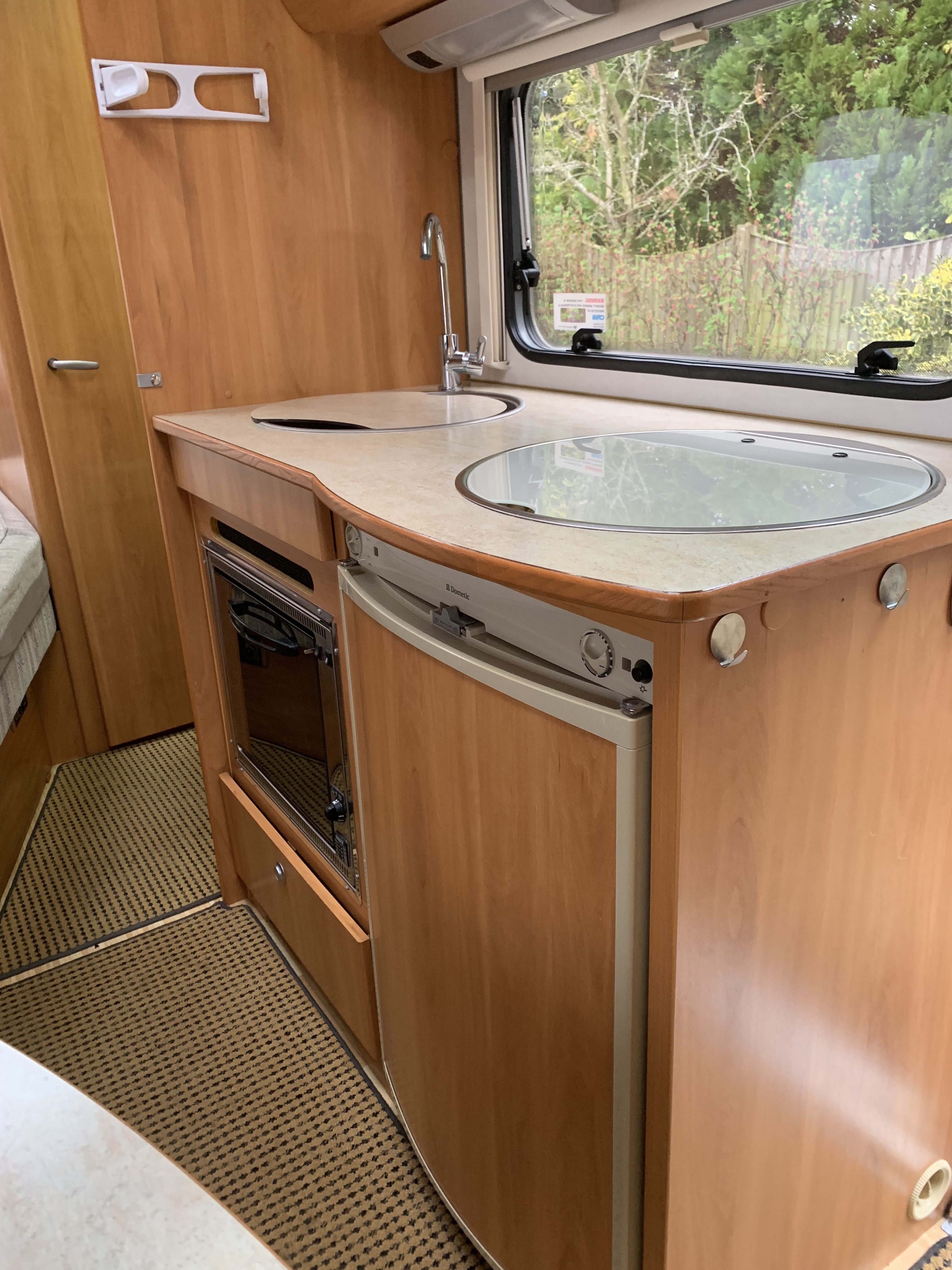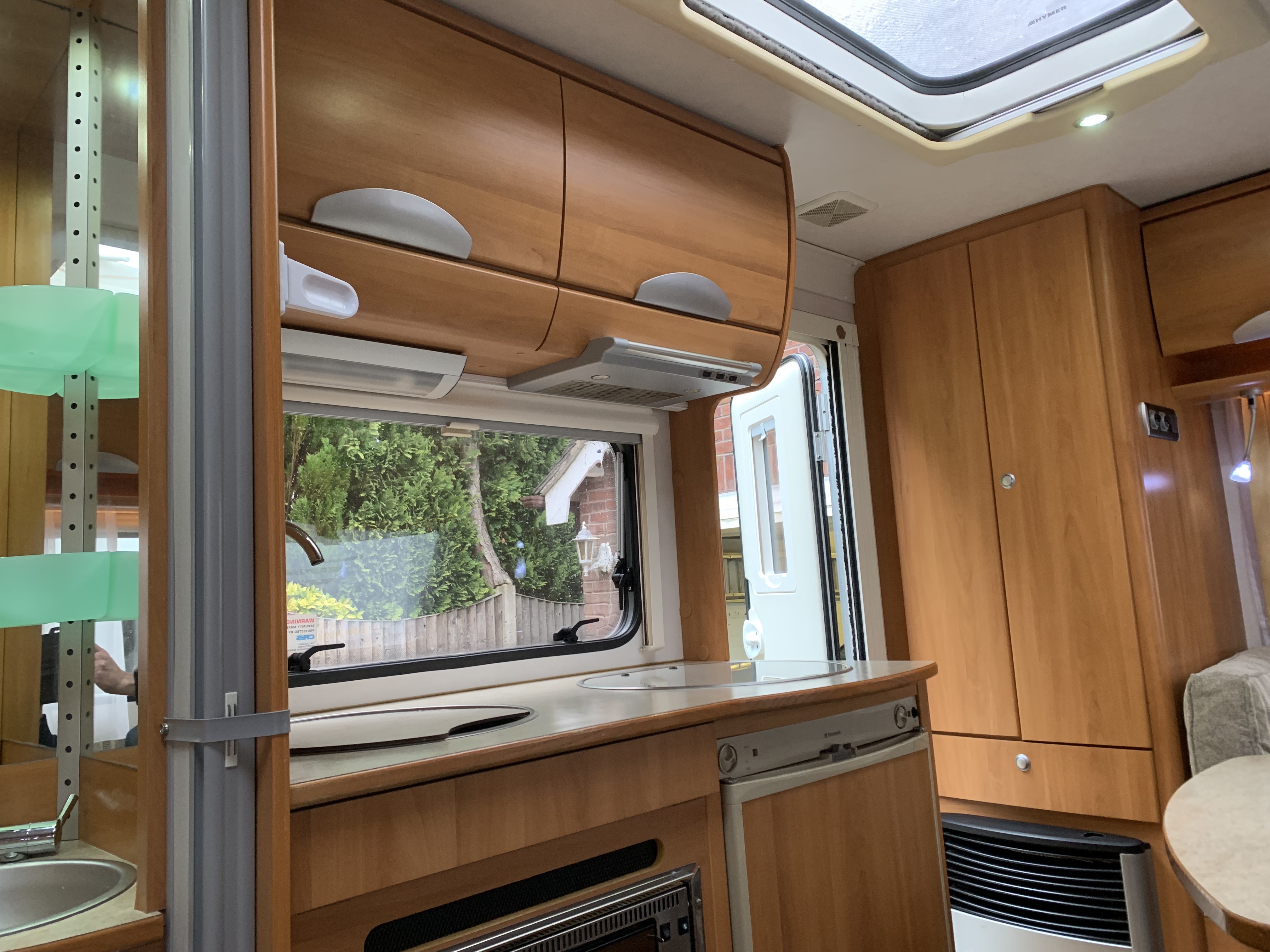 In exceptional condition this compact fixed bed German caravan has an “L” shaped lounge at the rear a washroom with a good size shower, electric flush cassette toilet and separate hand basin.