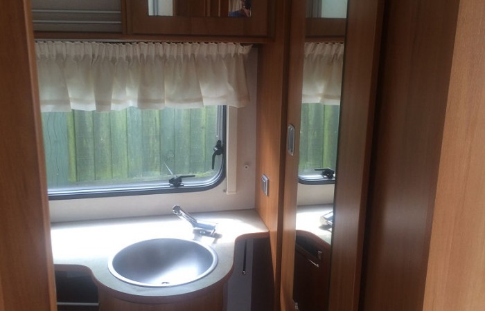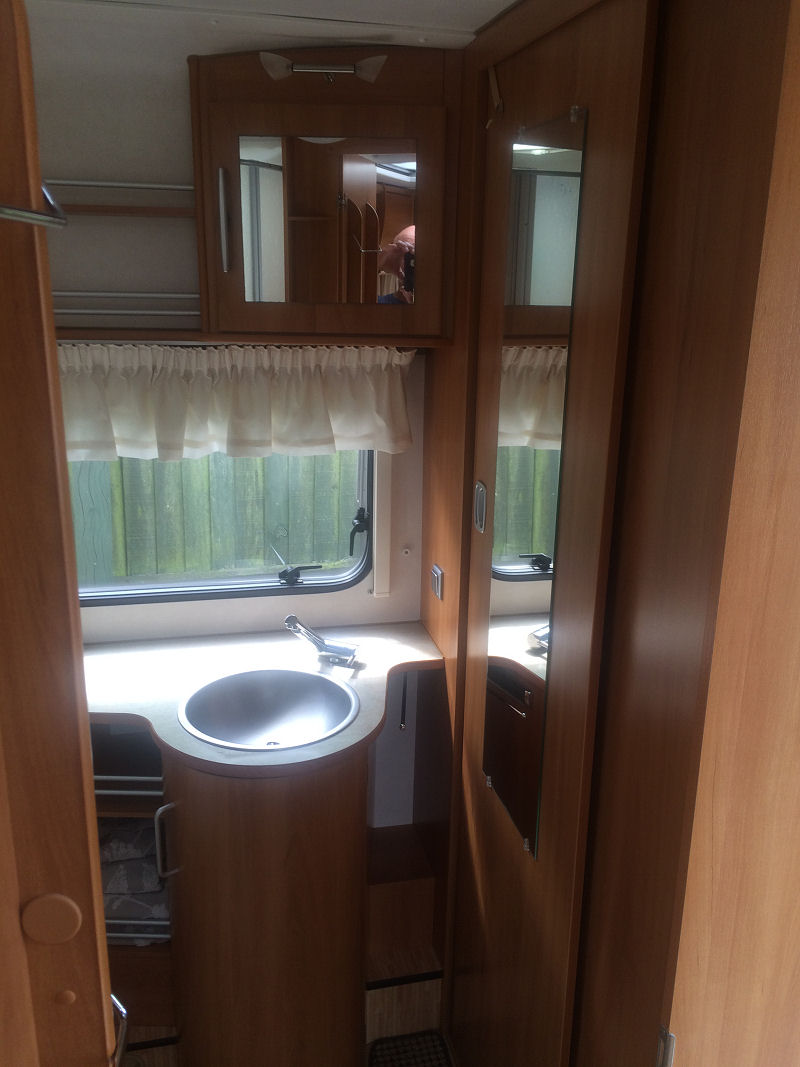 This beautiful 2 berth Hymer is in exceptional condition and has a spacious end washroom with a shower cubicle, cassette toilet with electric flush, hand basin and a good size wardrobe.