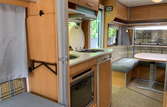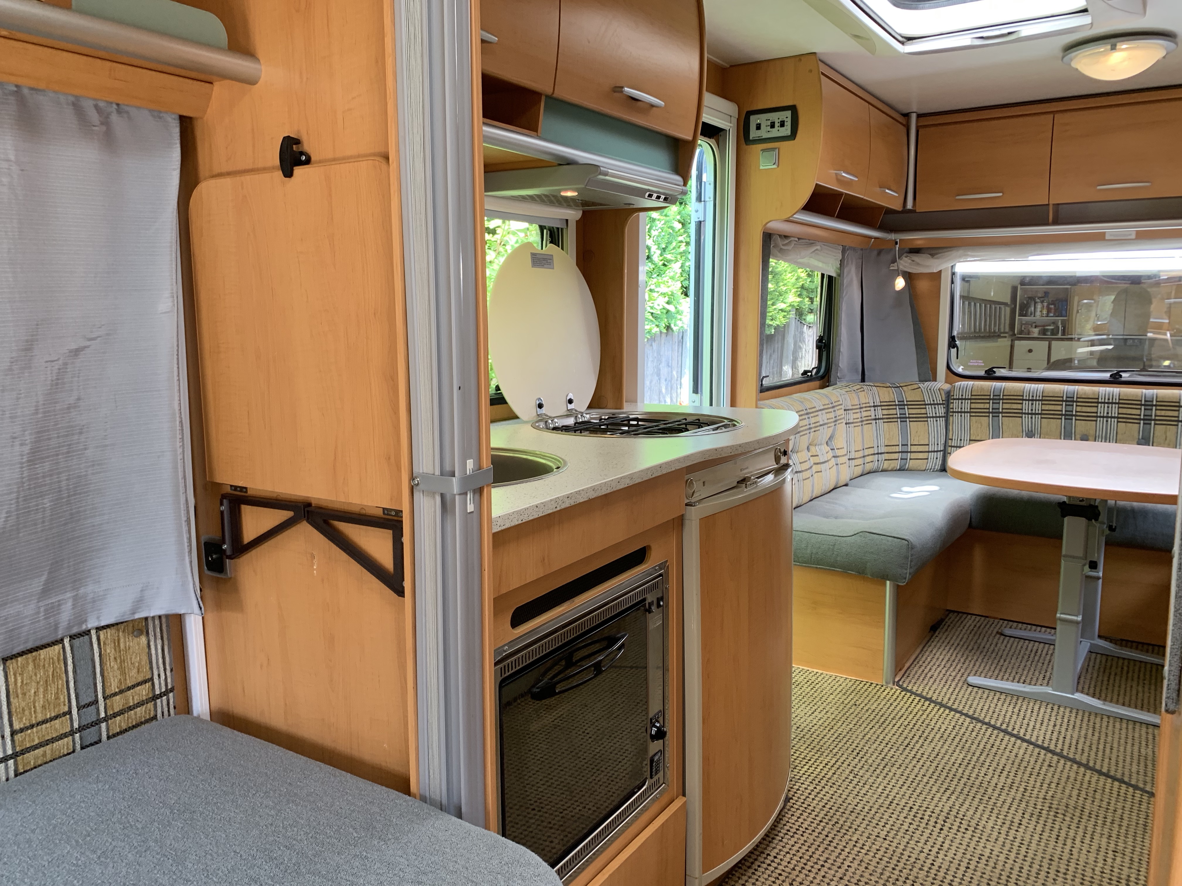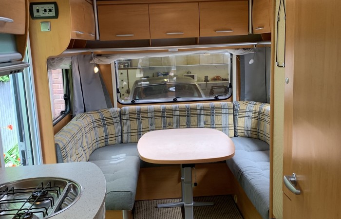This is another beautiful Hymer with a very versatile layout, two fixed comfortable beds in the front that can be used as seating and a “U” shaped lounge at the rear that converts to a large double bed.