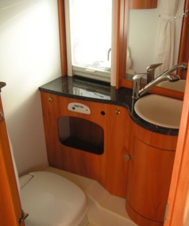 This caravan has a washroom with an electric flush cassette toilet, hand basin and shower.