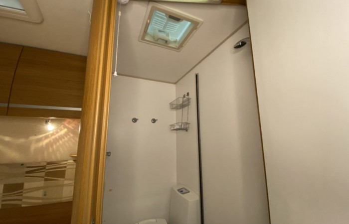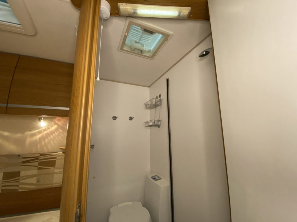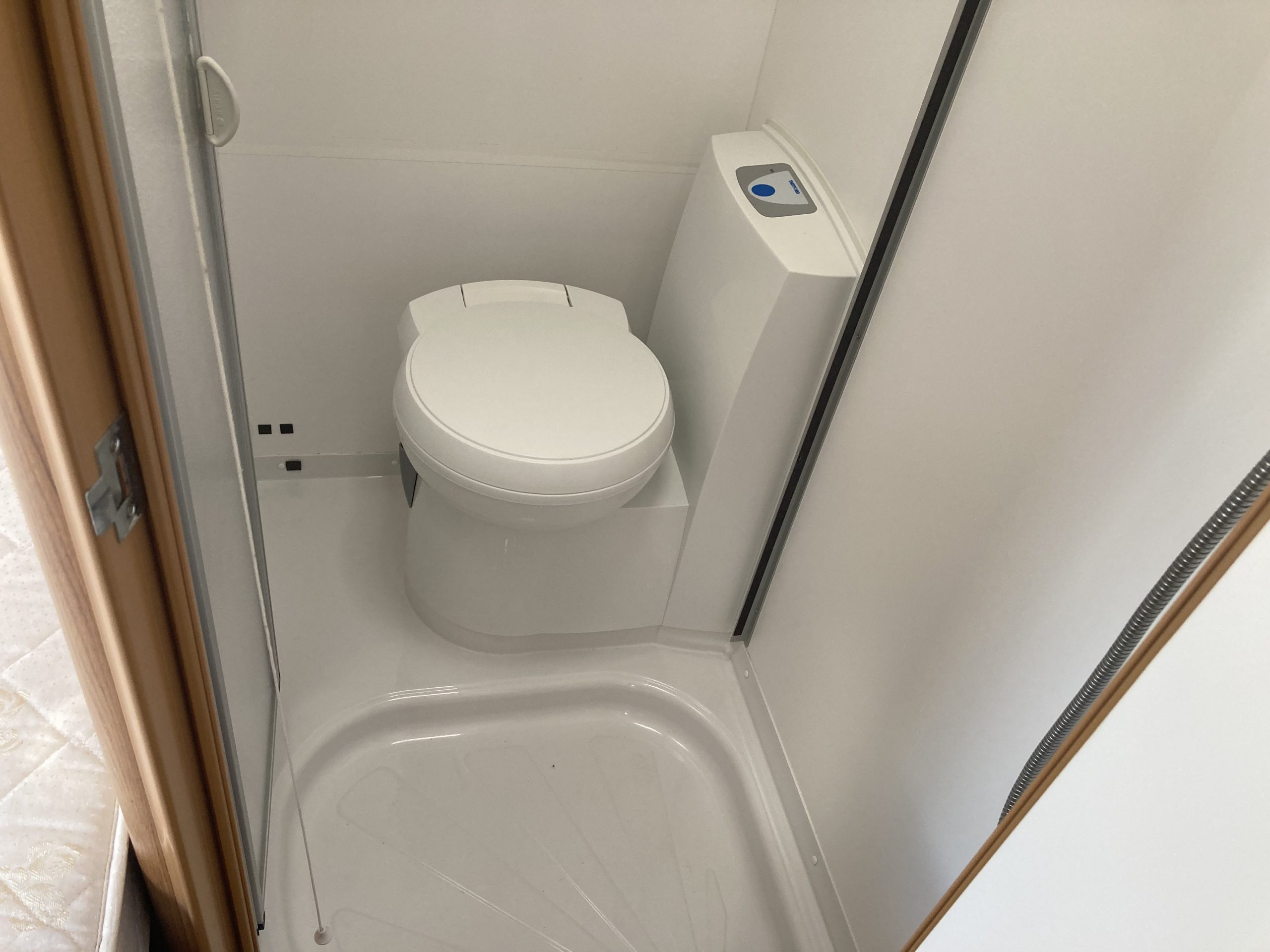 WASHROOM Corner washroom with screened shower and electric flush cassette toilet