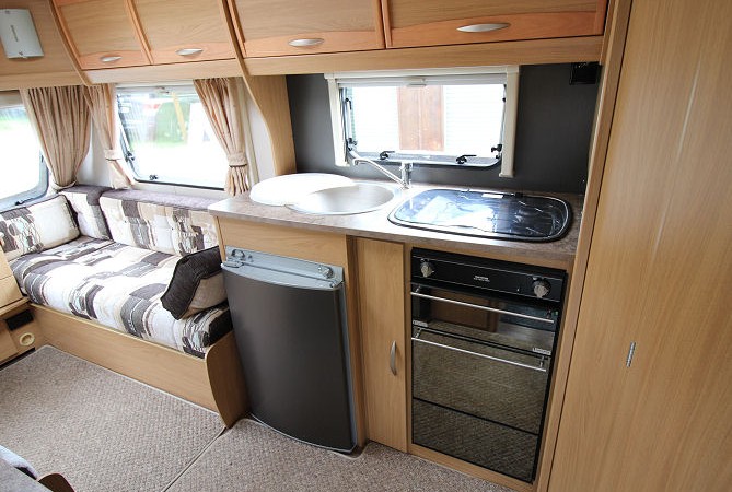Hob with 3 gas rings, gas oven with grill, sink & drainer, 3 way fridge/freezer (gas, 240v & 12v). Additional work bench and storage opposite.