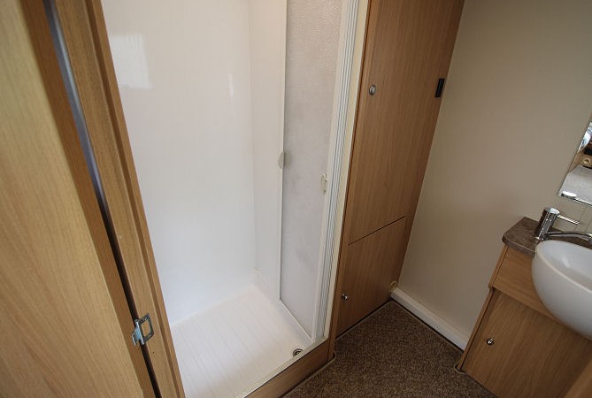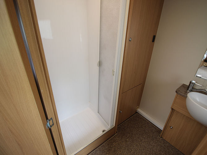 The privacy door reveals a spacious washroom with fully lined shower cubicle, vanity, cassette toilet and wardrobe